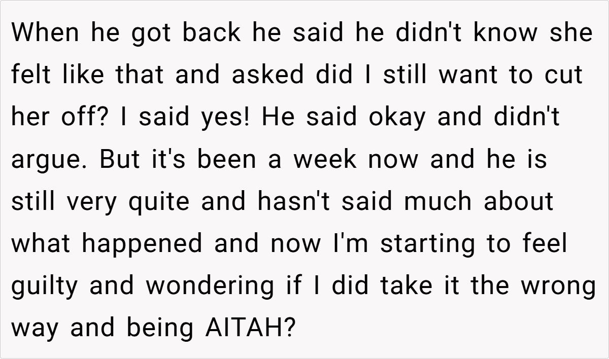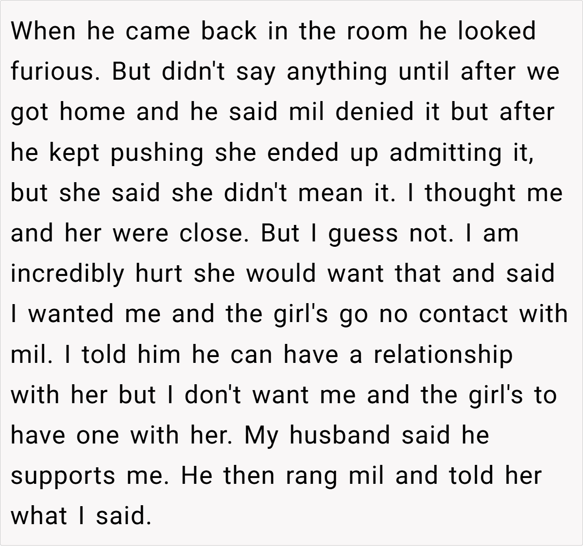 In conclusion, while feelings of guilt may creep in after making a difficult decision, the need to protect yourself and your children from ongoing emotional harm is both valid and necessary. The MIL’s comments were profoundly damaging, and choosing to cut contact is a step toward ensuring a safe and supportive environment for your daughters.