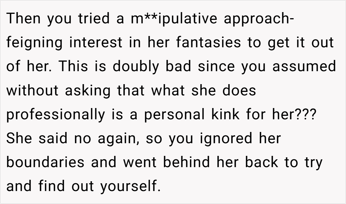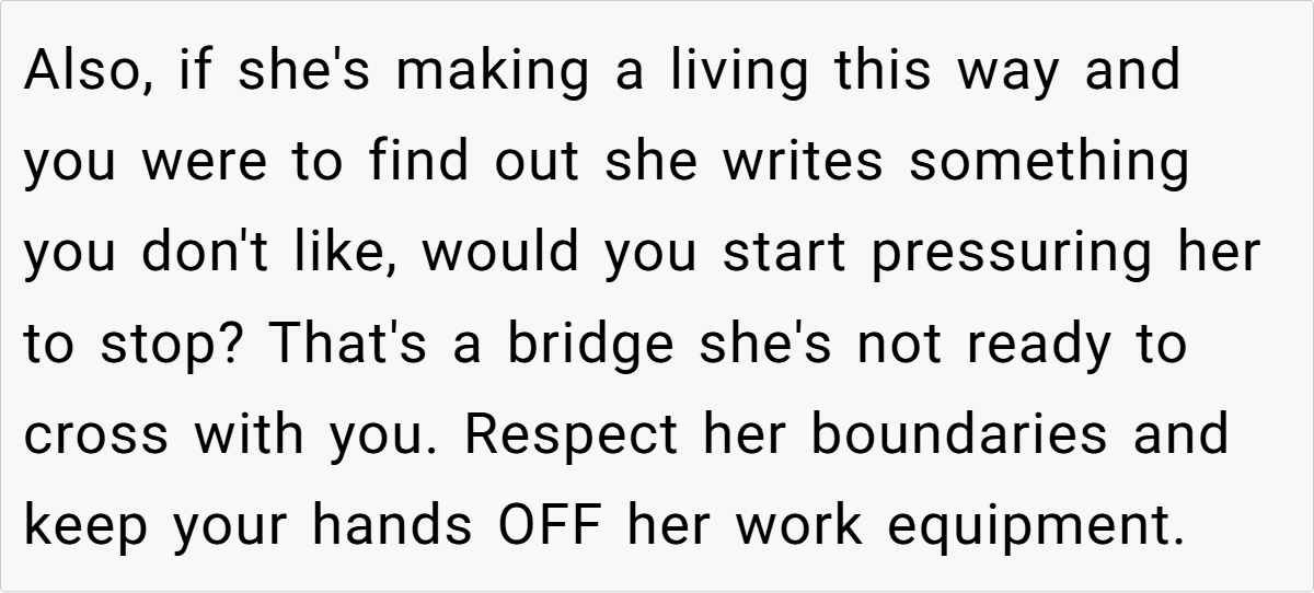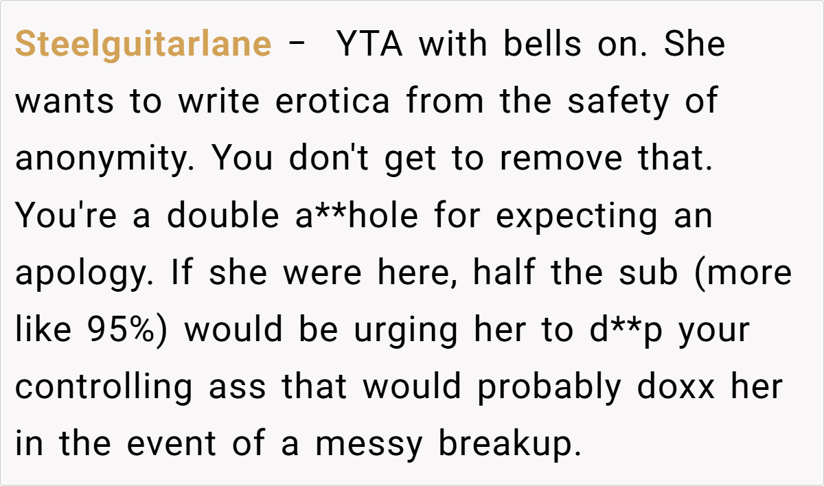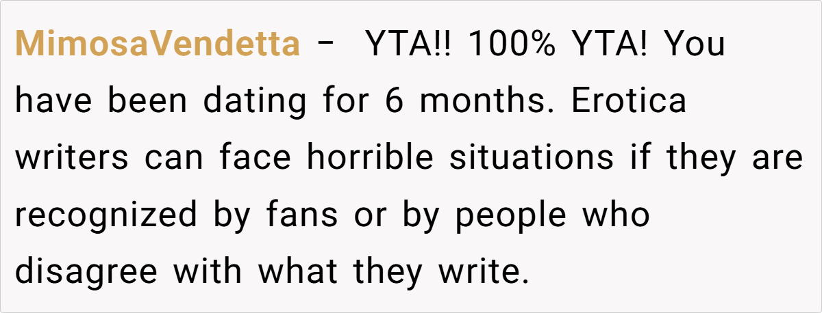 The online community is divided on this issue. Many believe that the narrator overstepped by demanding access to a private aspect of his girlfriend’s professional life, arguing that her pen name is a legitimate means of protecting her identity and creative work.