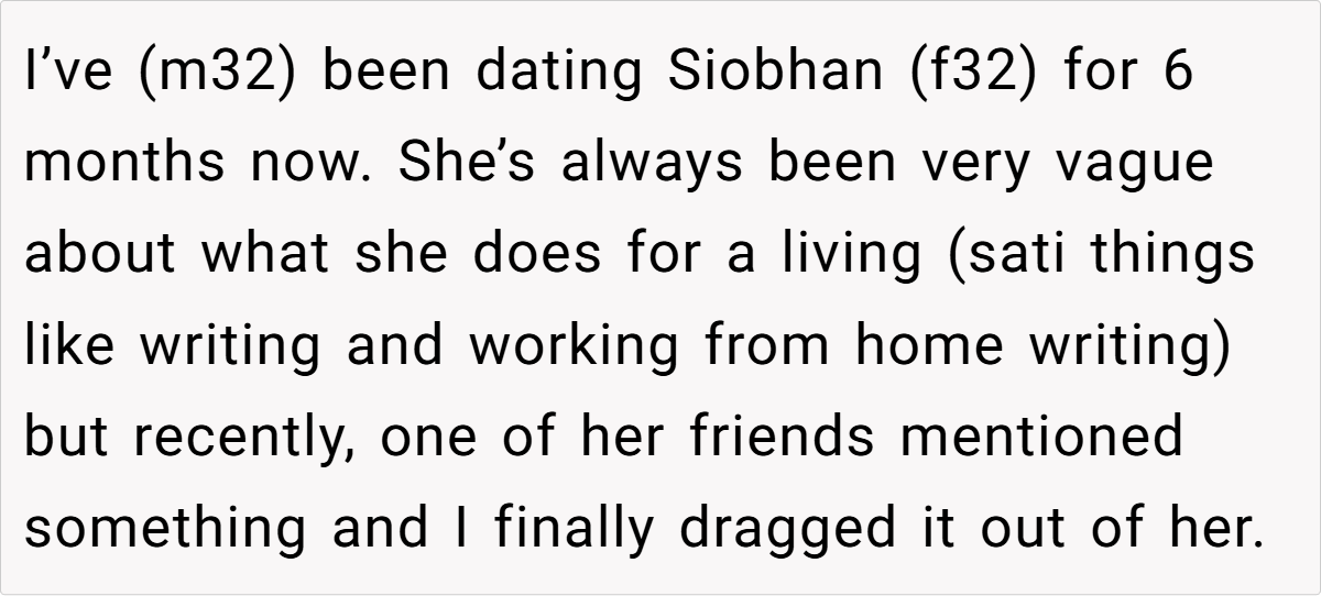 In this account, a 32-year-old man recounts the escalating conflict in his six-month relationship with Siobhan, a woman who writes and self-publishes romance and erotica under a pen name. Despite her vague explanations about her work, her secretive use of a pen name eventually sparked a heated dispute.