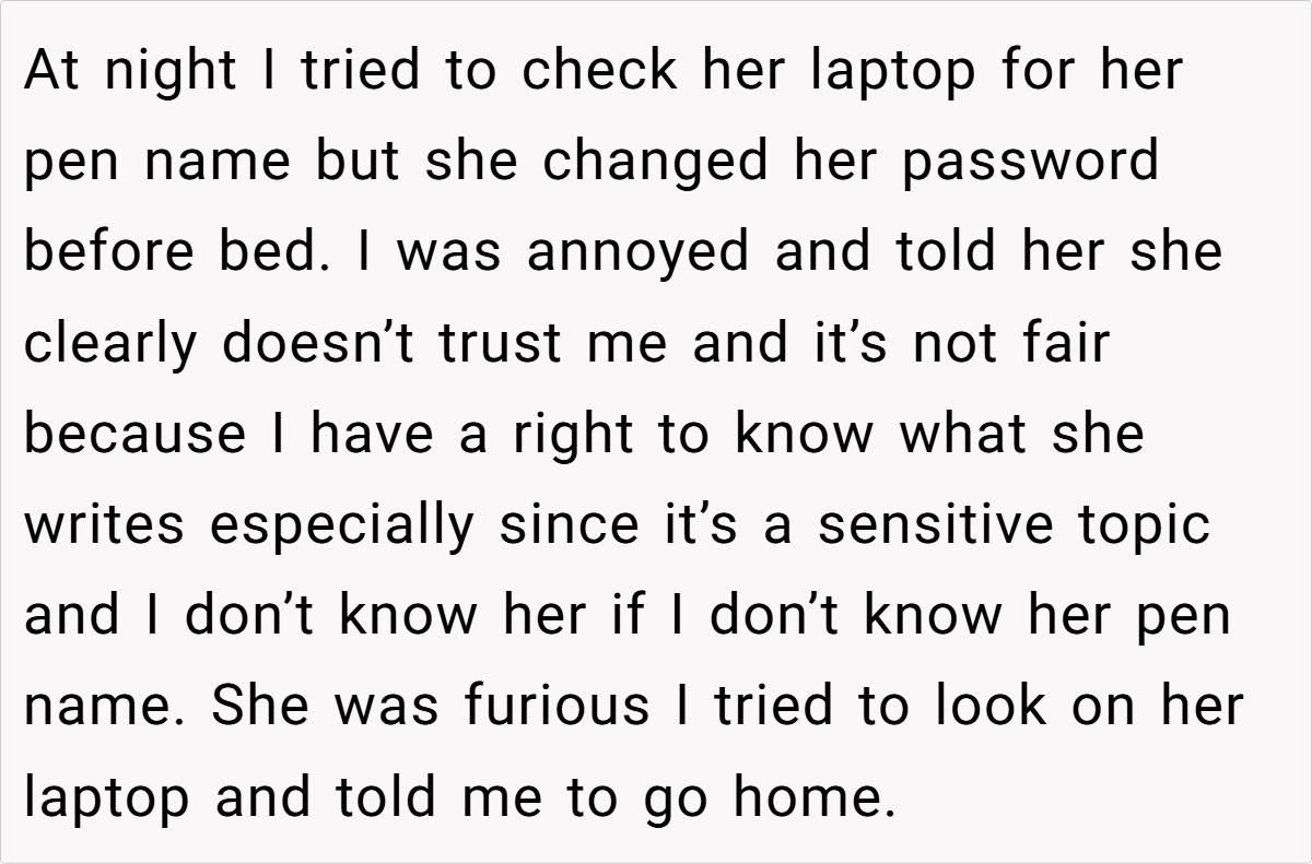 The situation reached a boiling point when he demanded that she reveal her pseudonym, citing a need for transparency about her creative work—even going so far as to attempt checking her laptop. This confrontation not only raised issues of trust and privacy but also left both parties reeling from the fallout. Read the full story below…