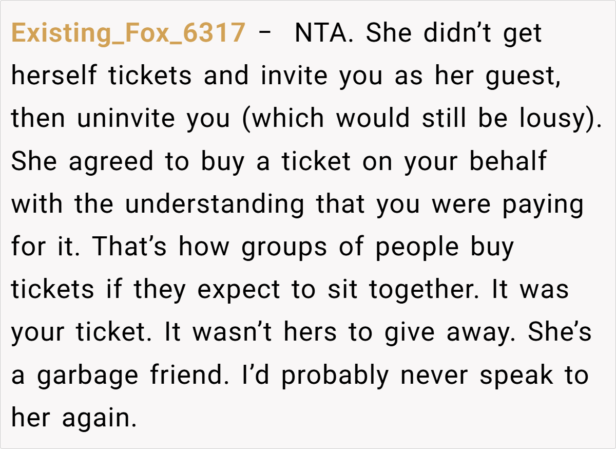 Letting a friend manage something as significant as concert tickets is not just about logistics—it speaks volumes about trust and mutual respect in any relationship. When agreements, especially those involving finances and cherished experiences, are abruptly altered, the underlying bond is put under severe strain. Miscommunication and unmet expectations can quickly escalate into a feeling of betrayal, as seen in this situation.