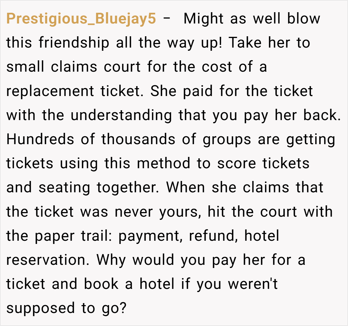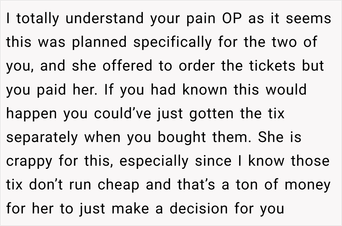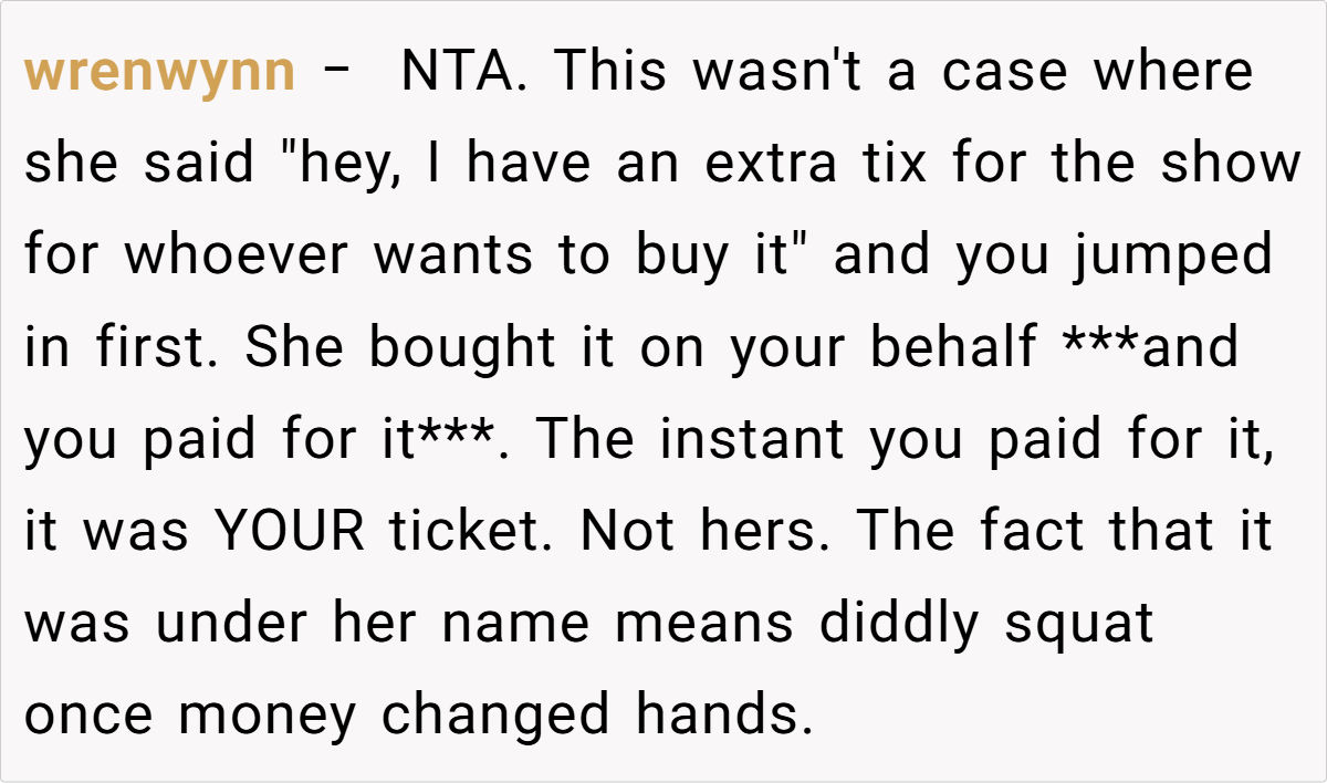 In cases like these, it’s important to recognize the value of clear, upfront communication. The storyteller’s pain isn’t merely about a concert ticket; it’s about the erosion of a promise between two people who once shared deep trust. Financial transactions tied to emotional commitments demand transparency, and any deviation can have lasting repercussions on personal bonds.