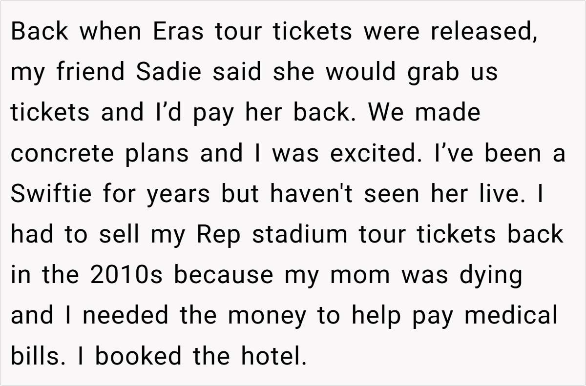 Yet, amid this hopeful anticipation, a trusted friendship was put to the test. A longtime friend, Sadie, who once shared in moments of joy and sorrow alike, unexpectedly changed the plan. What was meant to be a shared adventure turned into a betrayal of trust when Sadie redirected the tickets for her own personal plans. This sudden twist left our narrator grappling with disappointment and a deep sense of loss.
