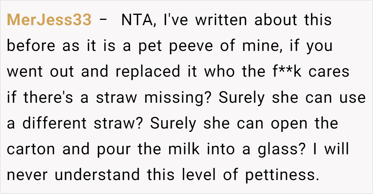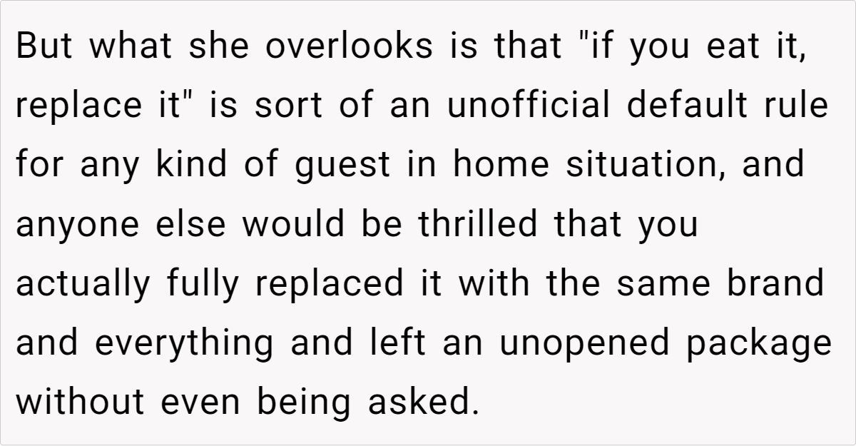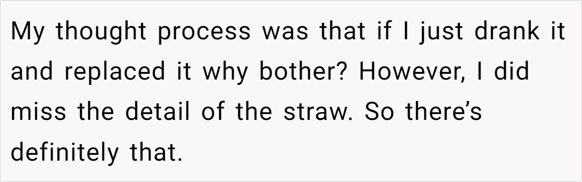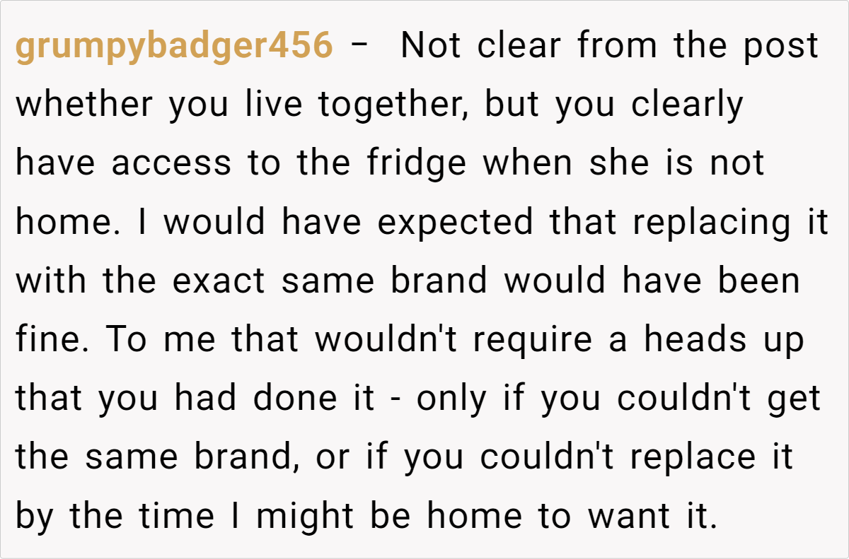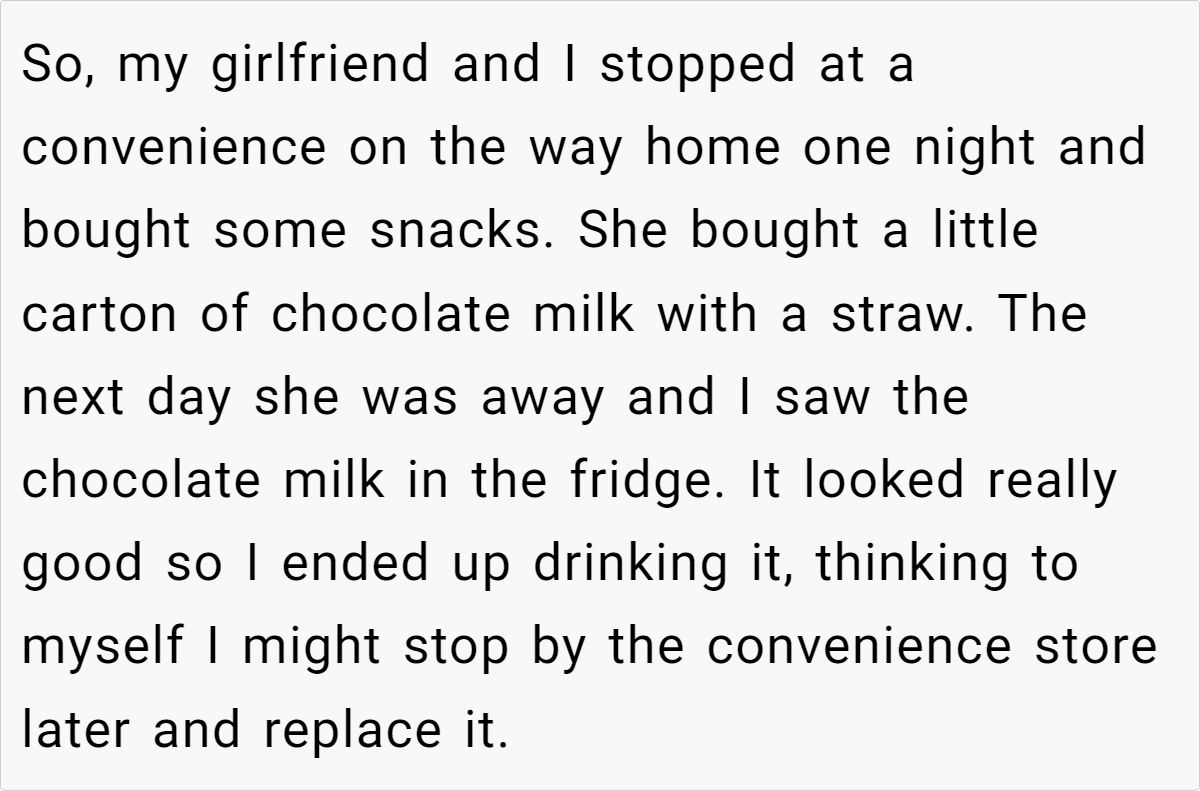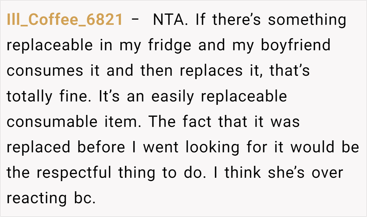 Sharing a life together often means sharing groceries, a fridge, and maybe even the last slice of pizza. But when does casual borrowing turn into disrespect? Small as it might seem, this story proves that even tiny moments can spark big discussions. Have you ever found yourself in a similar bind—unsure whether that leftover takeout or bottle of soda was fair game? Drop a comment below, and let’s talk about how we navigate these everyday gray areas. Boundaries, communication, or just a heads-up text—sometimes, that’s all it takes to keep the peace.