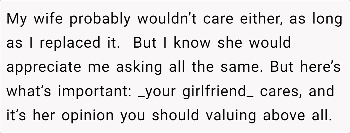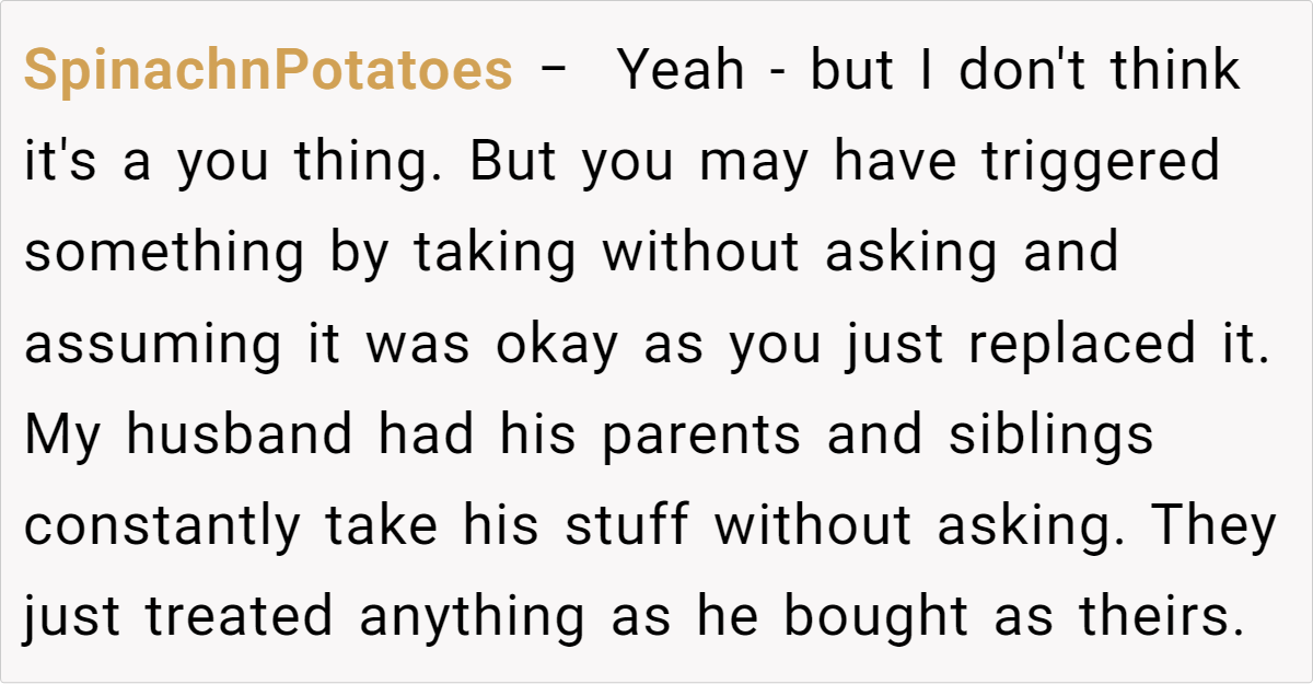 Furthermore, it’s crucial to consider each person’s background. Perhaps the girlfriend grew up in a household where siblings routinely took items without asking, leaving her feeling violated or overlooked. Meanwhile, the boyfriend might have come from a family culture where sharing was the norm, no questions asked. Social learning deeply influences how we approach shared spaces in adulthood, and acknowledging these differences helps calm emotional triggers.