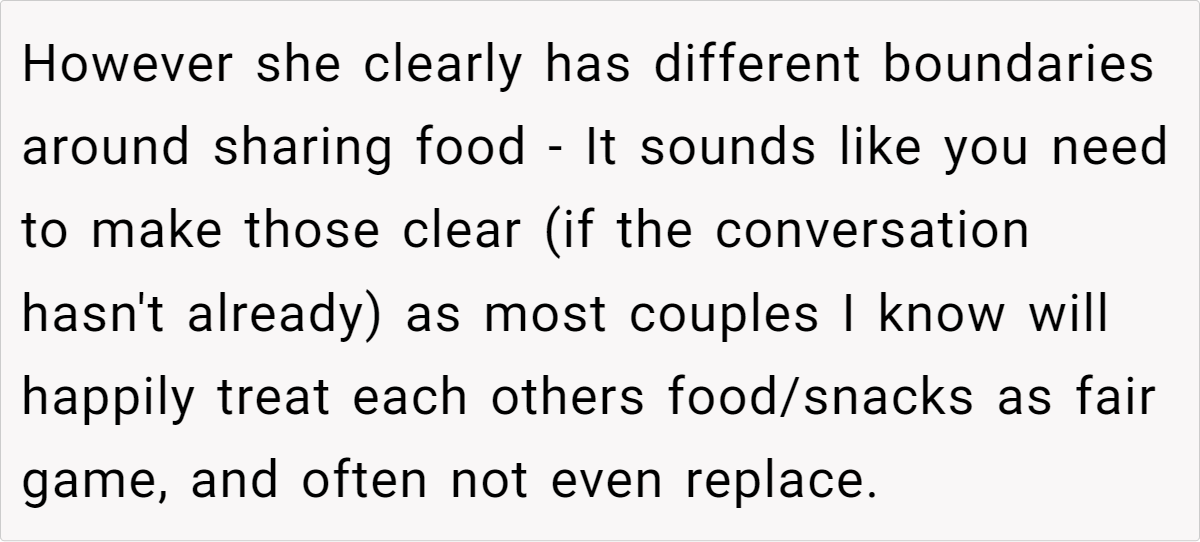Sometimes, what appears to be a small misunderstanding has larger implications that reveal each partner’s expectations in a relationship. Dr. Meg Wilson, a clinical psychologist specializing in couples therapy, emphasizes that “disagreements about daily habits—like sharing food—often point to deeper concerns about respect and empathy.” When someone takes something without asking, it can send a message that one partner’s feelings or autonomy are being overlooked.