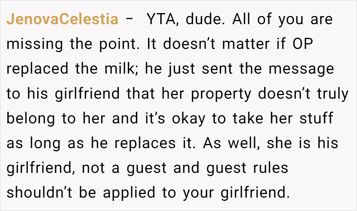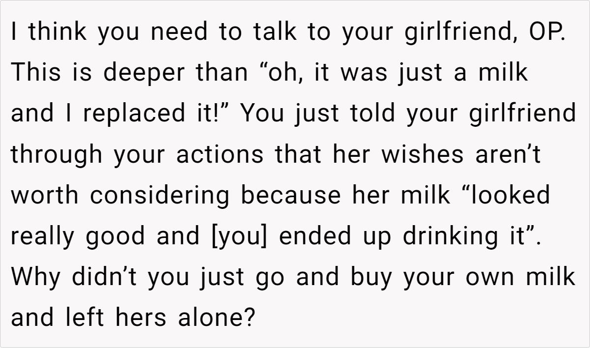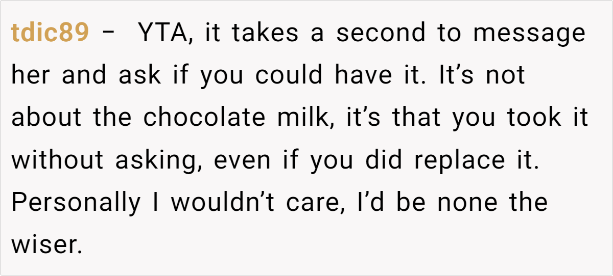 In this case, the item in question is chocolate milk—a low-stakes item that’s easily replaceable. However, Dr. Wilson notes that the bigger picture is about communication. The girlfriend feels that her boyfriend not only took her property without permission but also failed to inform her, making her wonder if he respects her preferences. “Open dialogue can solve so many conflicts before they escalate,” Dr. Wilson adds. “A simple text message or note can foster a sense of mutual understanding.”