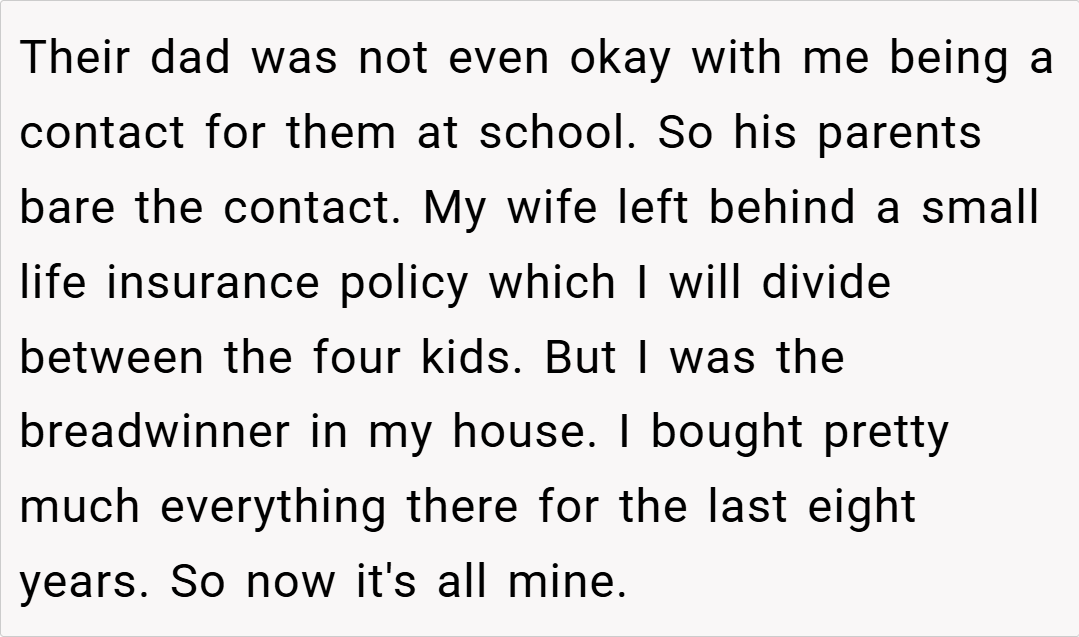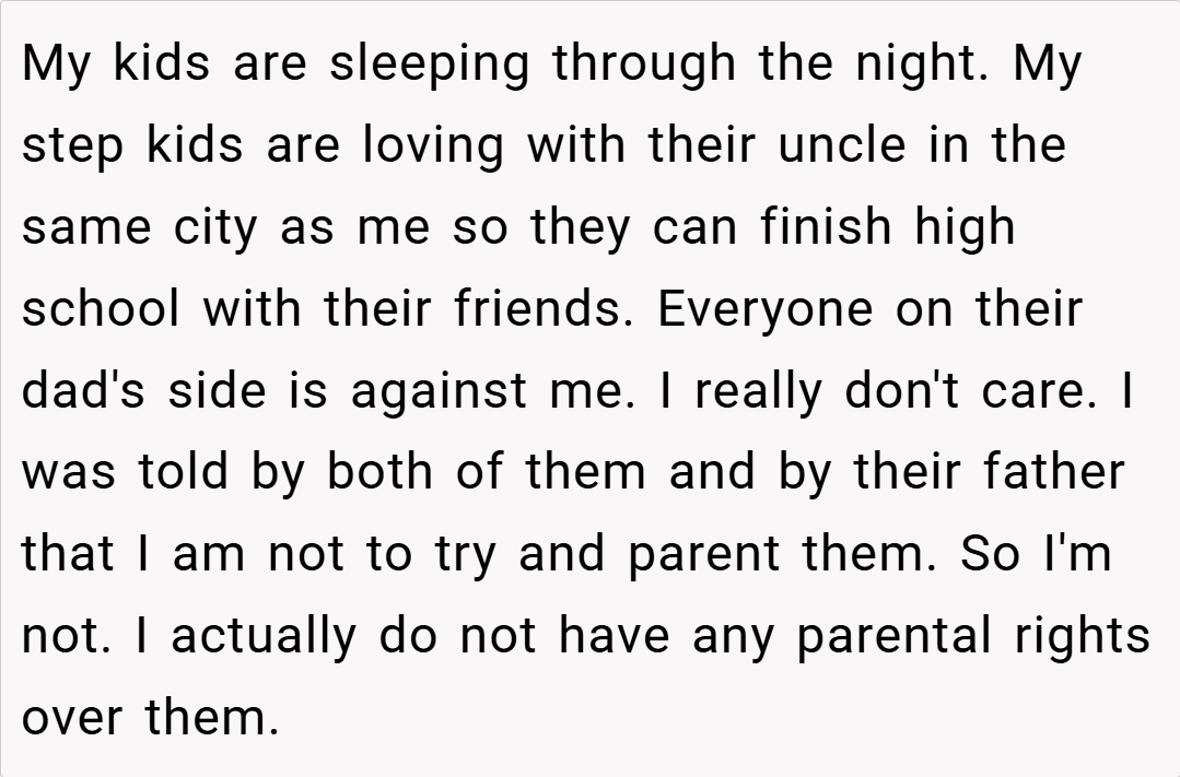 Letting go of a partner is never easy, and when blended family dynamics are thrown into the mix, the challenges multiply. It’s important to acknowledge that grief can drastically alter behavior. In this case, the loss of a wife has left our storyteller grappling with deep emotional pain, while his stepchildren struggle to find their footing in a world without their biological mother. Clear boundaries, though sometimes painful, are essential for survival during such turbulent times.