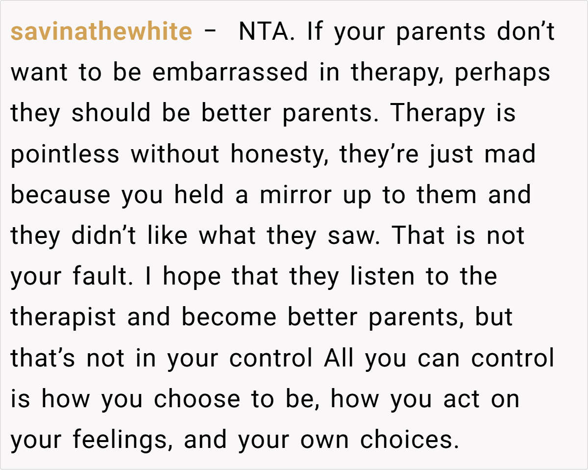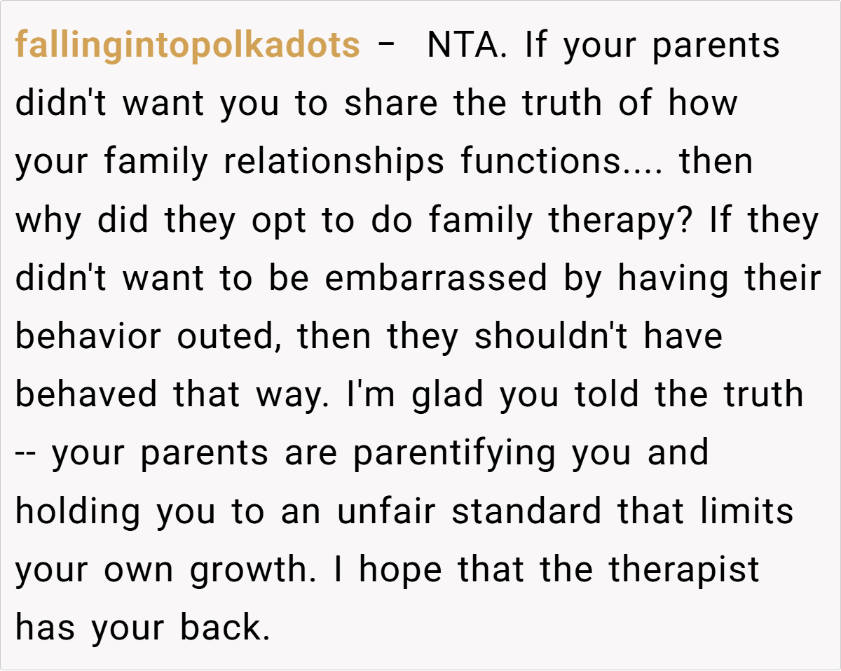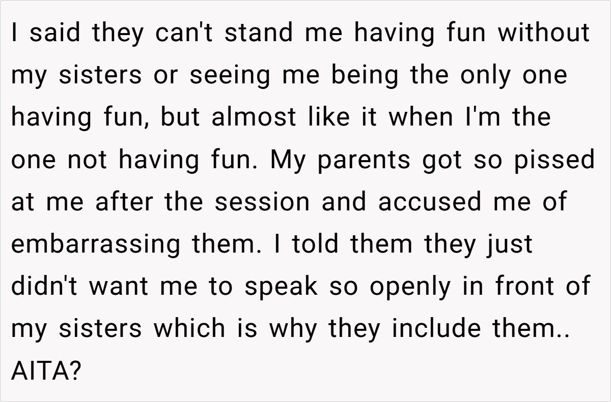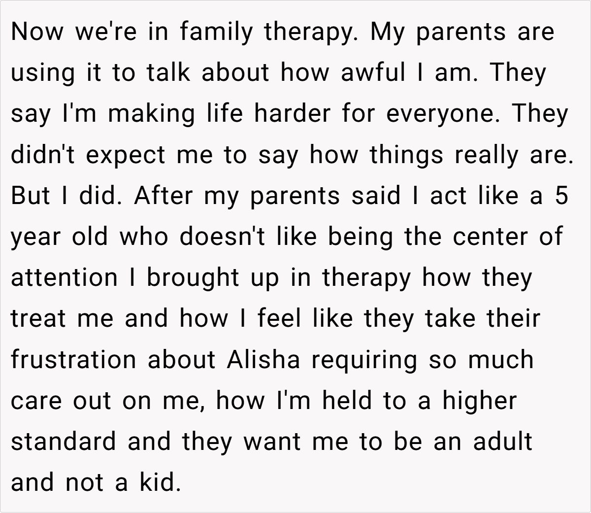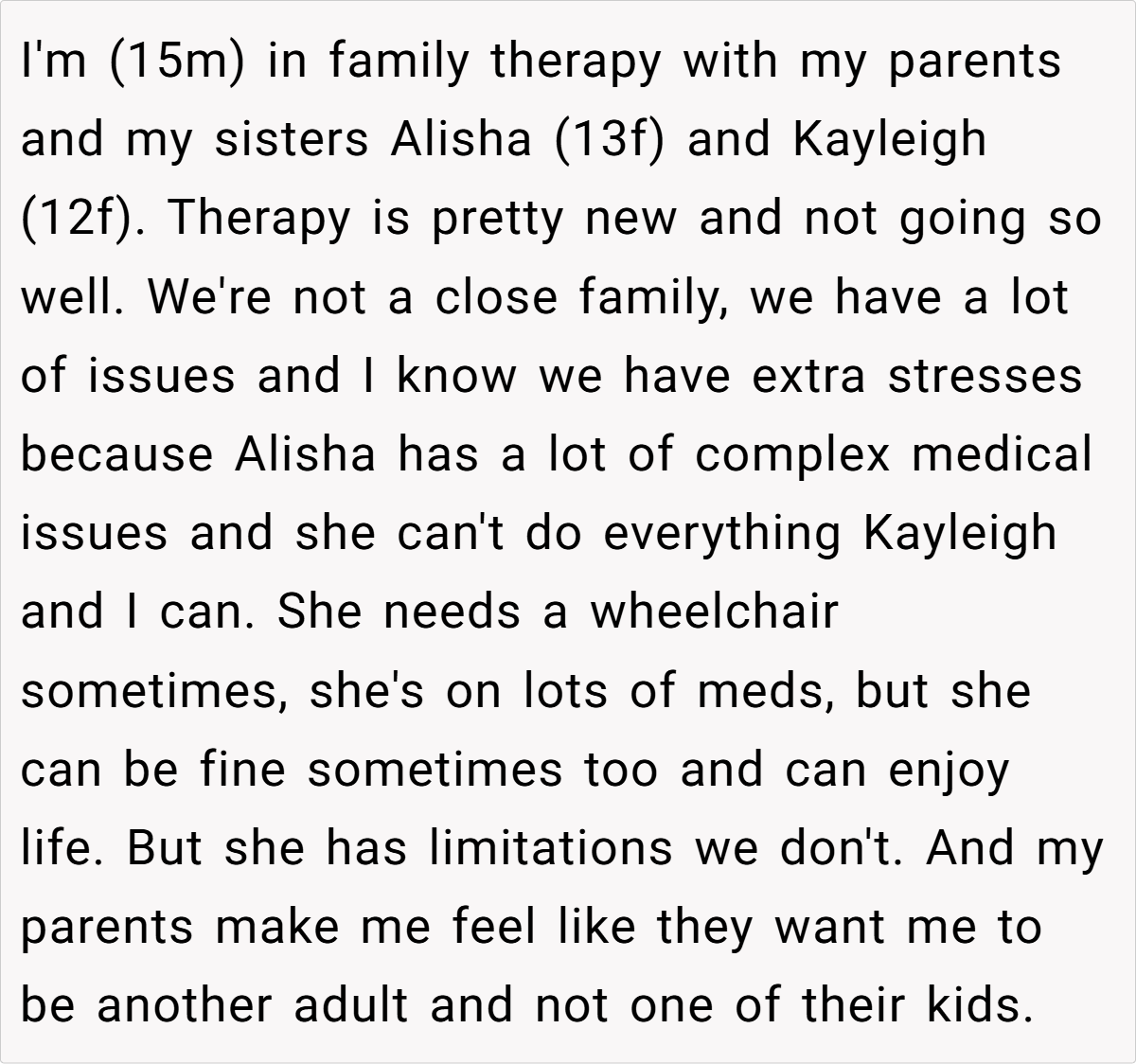 At first glance, a family therapy session might seem like a safe space to untangle long-held tensions, but for this redditor, it’s become a stage for an even more complicated drama. A 15-year-old caught between the roles of a caring sibling and an unexpected parental surrogate, he paints a picture of a household where responsibilities are skewed and fun is in short supply. The session was meant to mend fences, yet it ended up exposing deep-seated issues and emotional boundaries that have long been ignored.