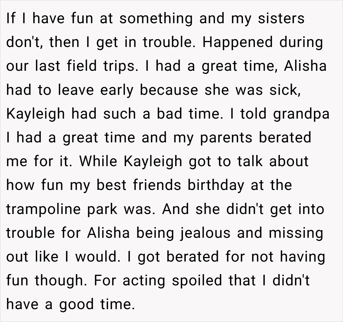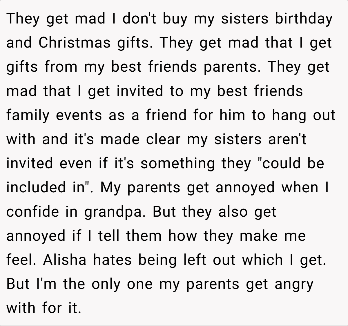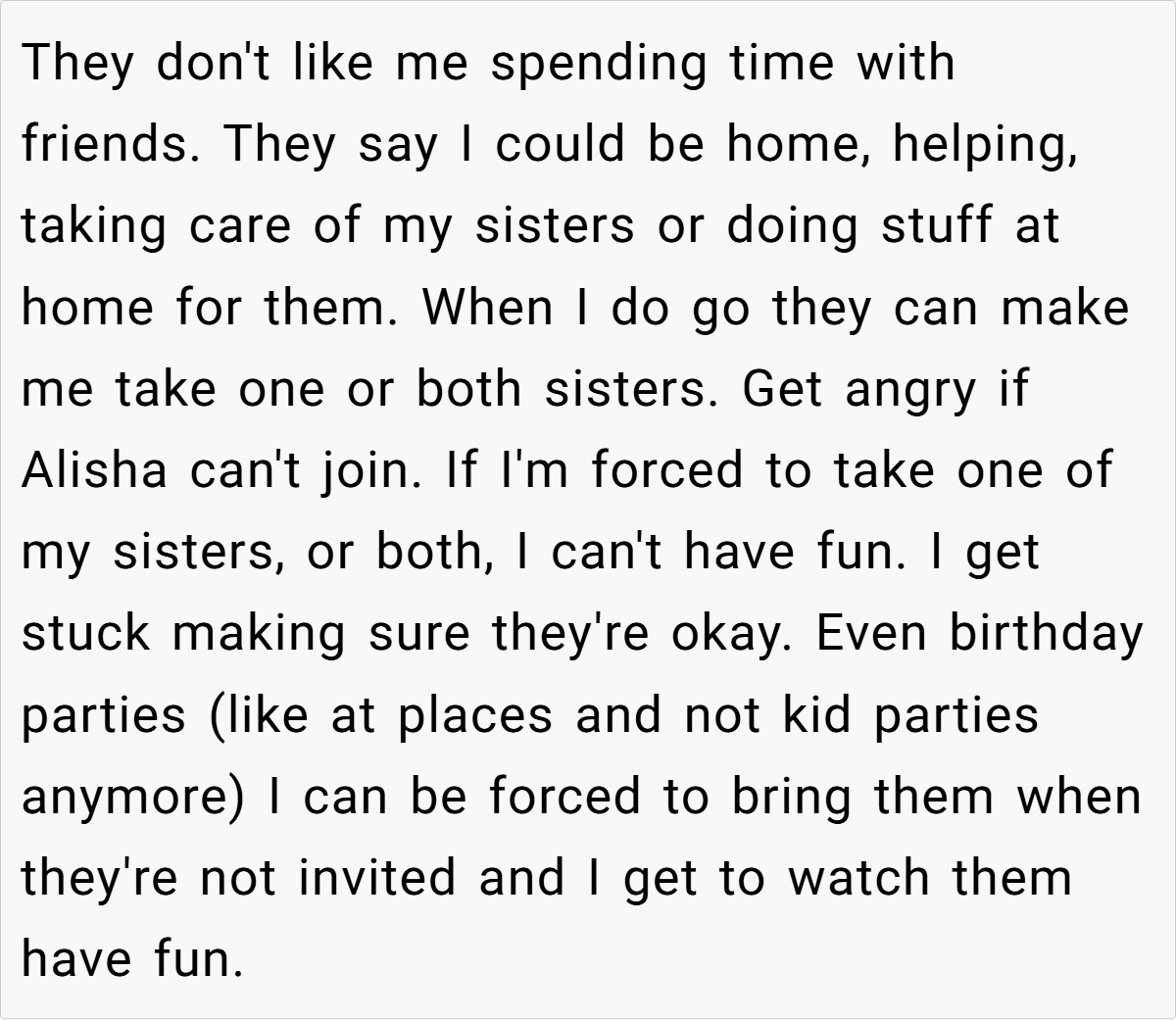 In this situation, the teen describes being sidelined from his own experiences while shouldering the burdens of caregiving. Constantly monitored and held to impossibly mature standards, he is expected to suppress his need for fun and autonomy. The resulting pressure not only stifles his social life but also jeopardizes his emotional well-being, making it hard for him to enjoy moments that should be part of a typical adolescence.