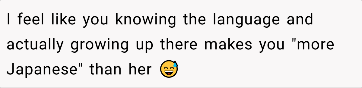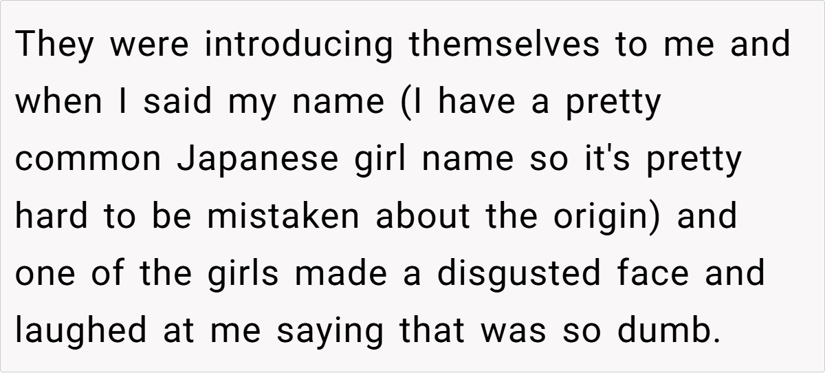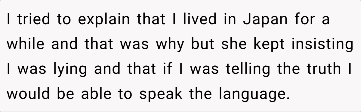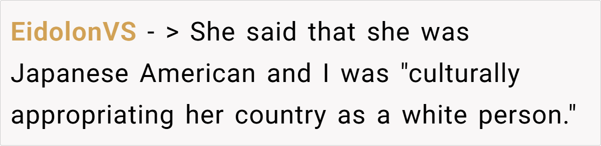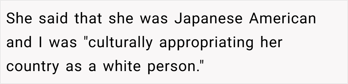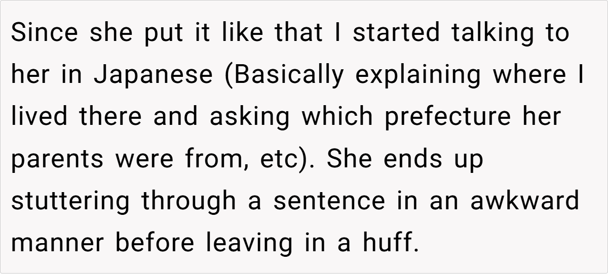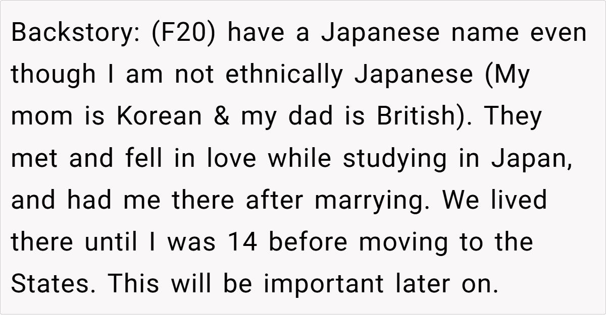 That’s the situation OP found herself in. Born in Japan to a Korean mother and British father, she lived there until she was 14 and has a Japanese name as a result. When she introduced herself to a friend of her roommate, this person immediately accused her of cultural appropriation, assuming OP had no real connection to Japan. Even after OP explained, the other girl refused to believe her—until OP spoke fluent Japanese, at which point the girl became flustered and left.
