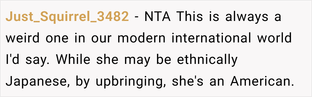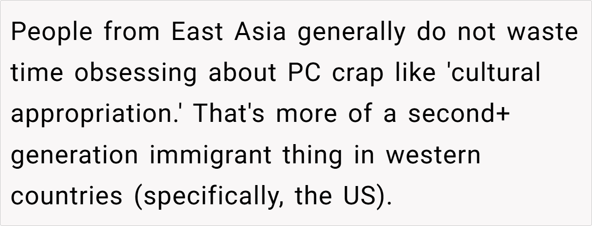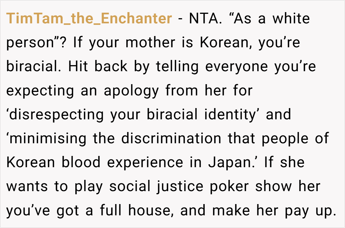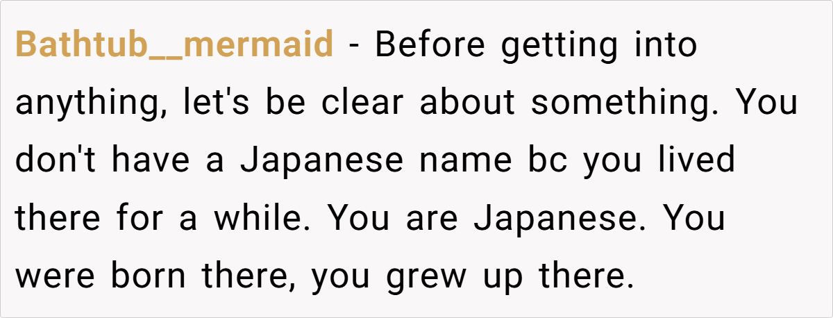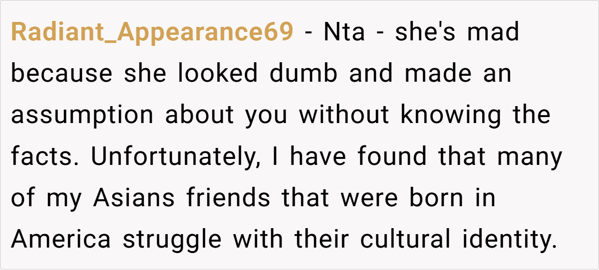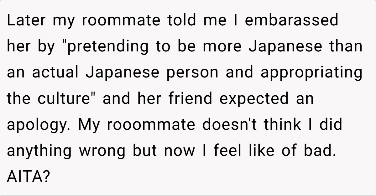 That’s the situation OP found herself in. Born in Japan to a Korean mother and British father, she lived there until she was 14 and has a Japanese name as a result. When she introduced herself to a friend of her roommate, this person immediately accused her of cultural appropriation, assuming OP had no real connection to Japan. Even after OP explained, the other girl refused to believe her—until OP spoke fluent Japanese, at which point the girl became flustered and left.