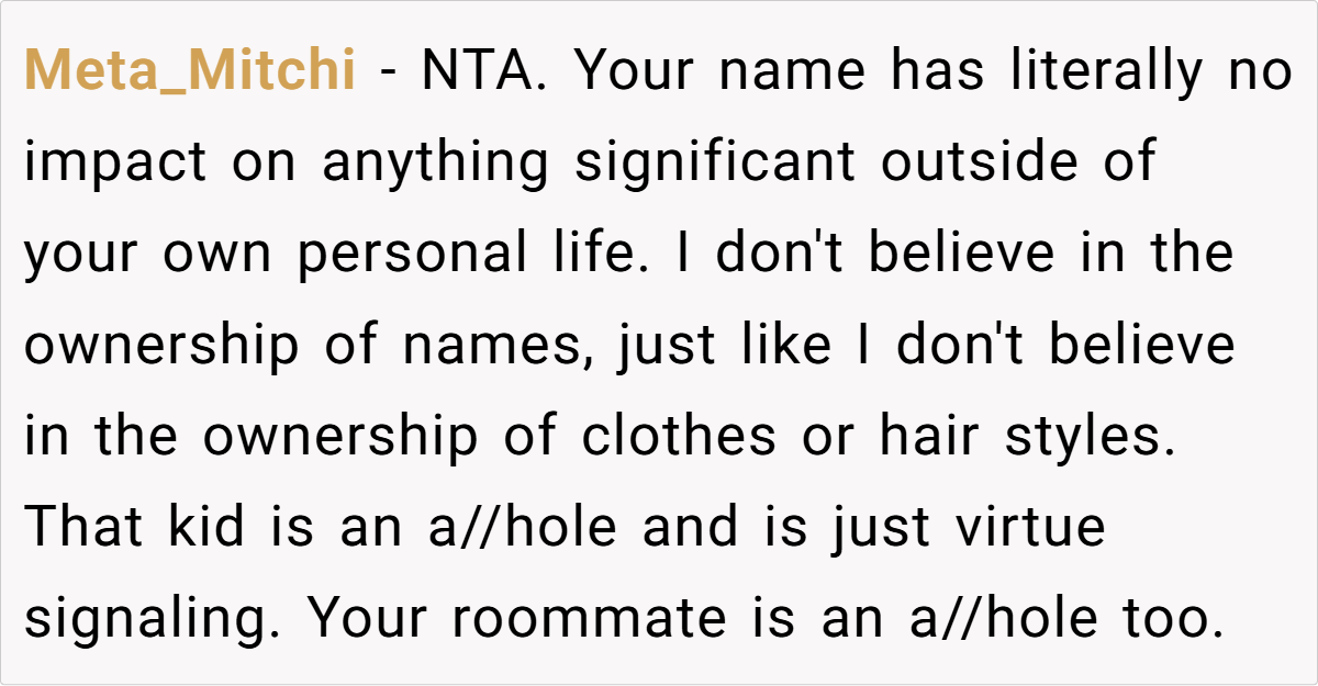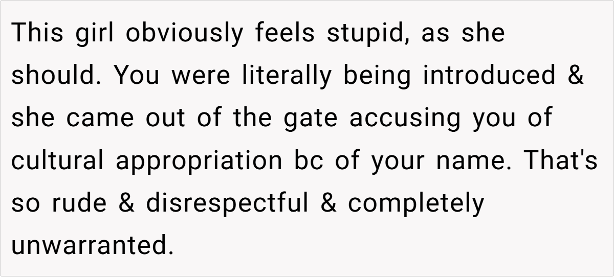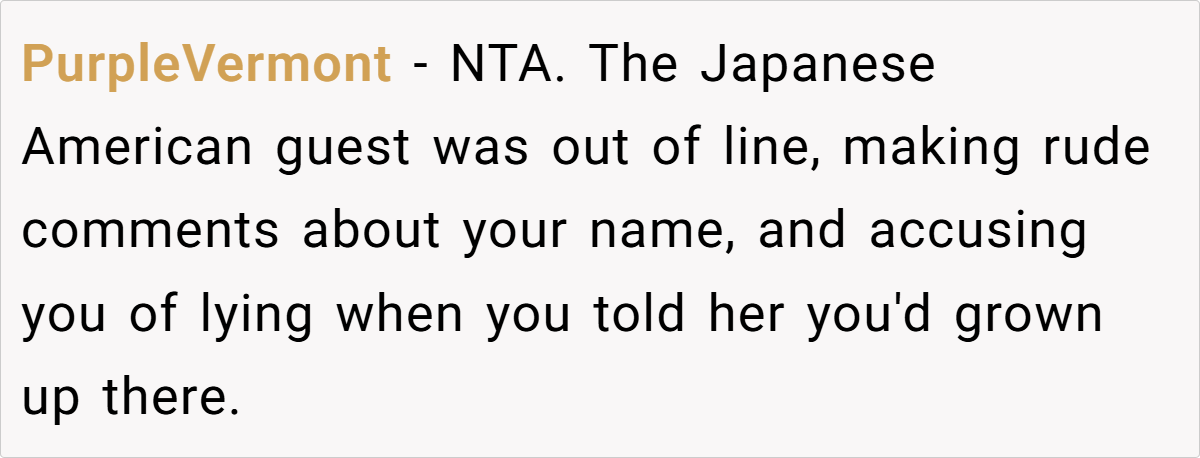 Most commenters agreed that OP was not in the wrong, pointing out that she didn’t choose her name or her upbringing. Many also felt that the guest embarrassed herself by making assumptions, then doubled down instead of admitting her mistake.