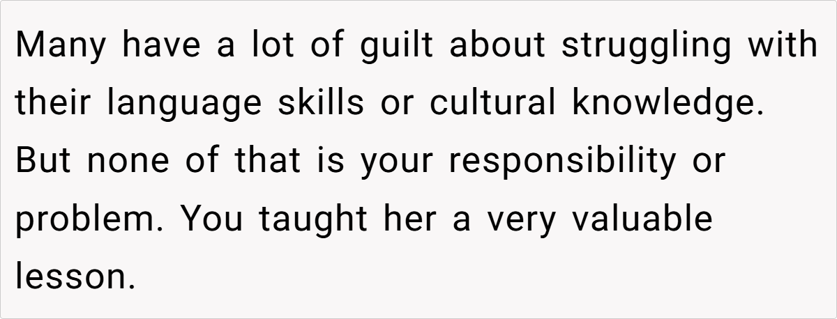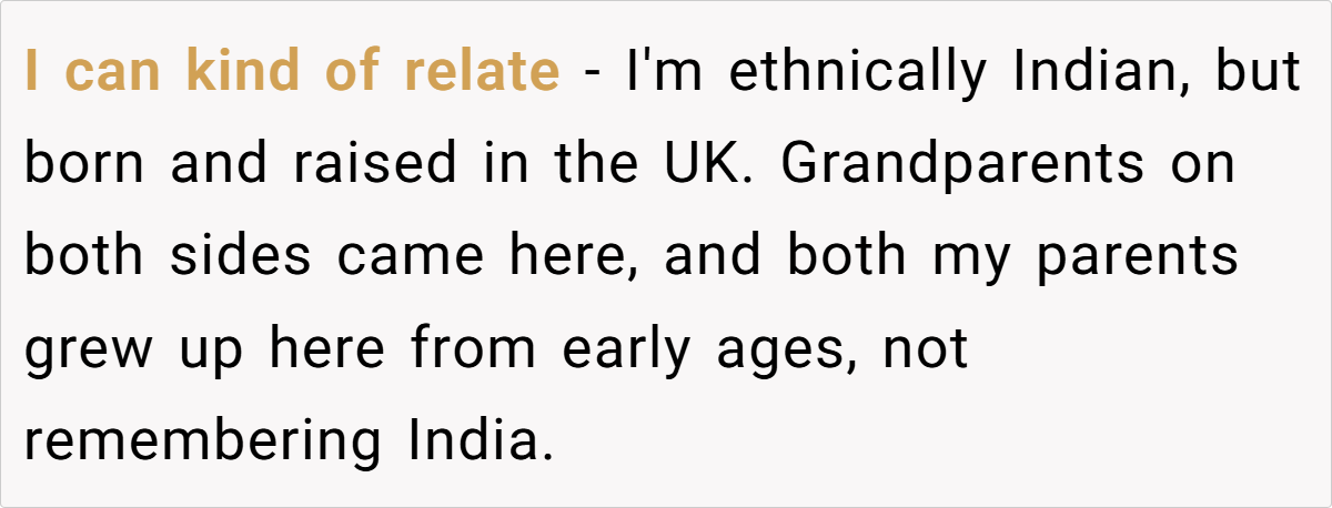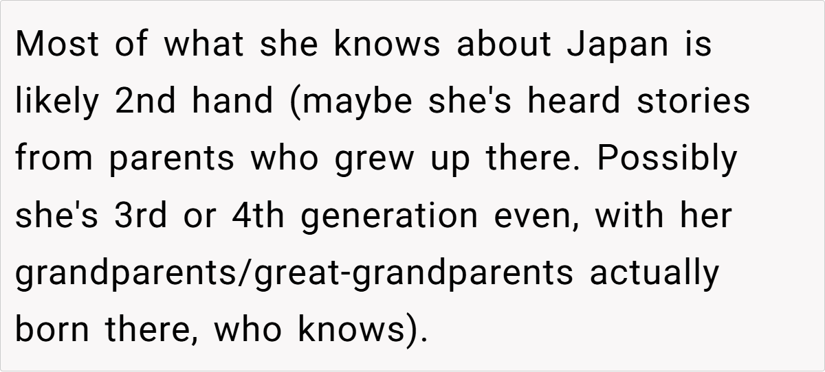 Others suggested that the guest may be struggling with her own cultural identity, as many second- or third-generation immigrants feel pressure to “prove” their cultural authenticity—especially if they don’t speak the language fluently or have direct experience living in their ancestral homeland.