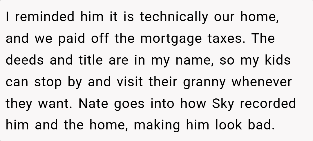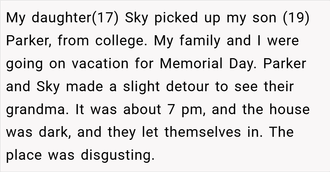 Despite his background in home health, Nate’s management of the house has been less than stellar—leaving it in disarray. When my children, Sky (17) and Parker (19), decided to visit their grandmother on a detour, they were met with a grim scene at the house.