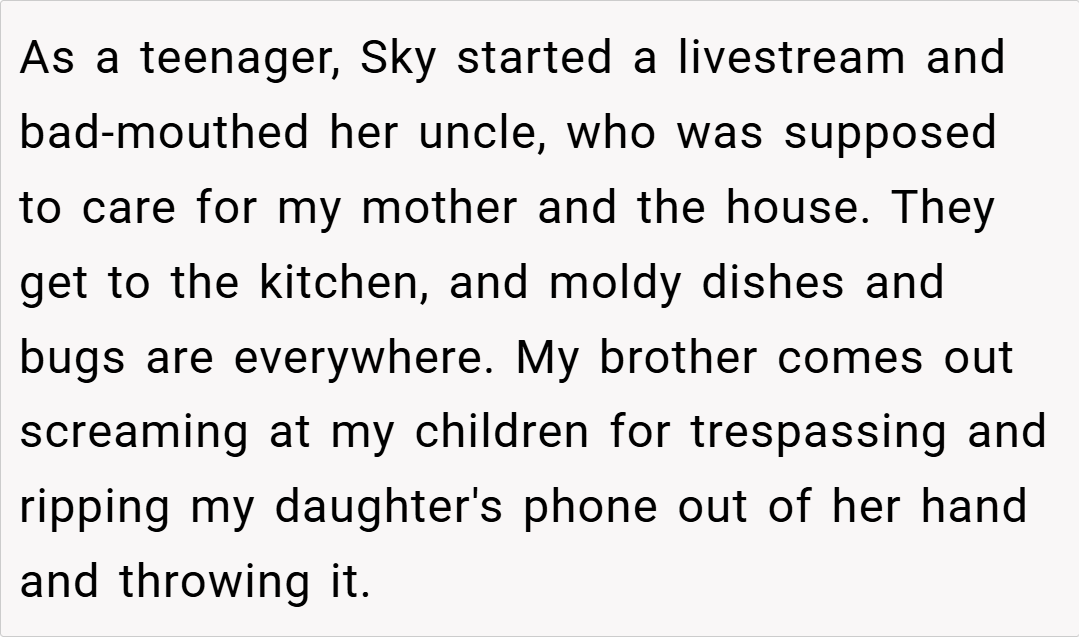 Amid the chaos of moldy dishes and bugs, my daughter ended up livestreaming and venting harshly about her uncle’s neglect. Now, as legal and family fallout ensues, I’m left wondering if I’m the asshole for encouraging my children to openly disrespect him.