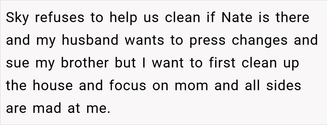 Ultimately, the situation highlights a painful family dynamic where neglect and unaddressed responsibilities have pushed my children to a breaking point. While I understand the criticism for encouraging disrespect, my frustration stems from years of seeing our family home deteriorate under Nate’s watch. This raises an important question: How do we help children express their feelings about family neglect in a way that leads to constructive change rather than further conflict?