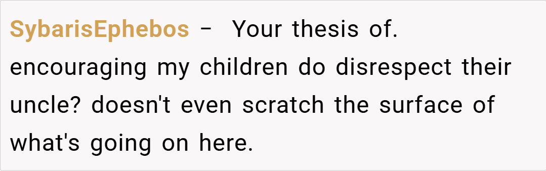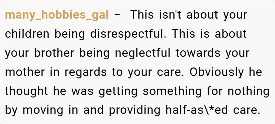 Another commenter shared, “I get that you’re upset with your brother’s neglect. Encouraging your kids to express how they feel can be healthy, but it’s also important to guide them on how to do it constructively.”