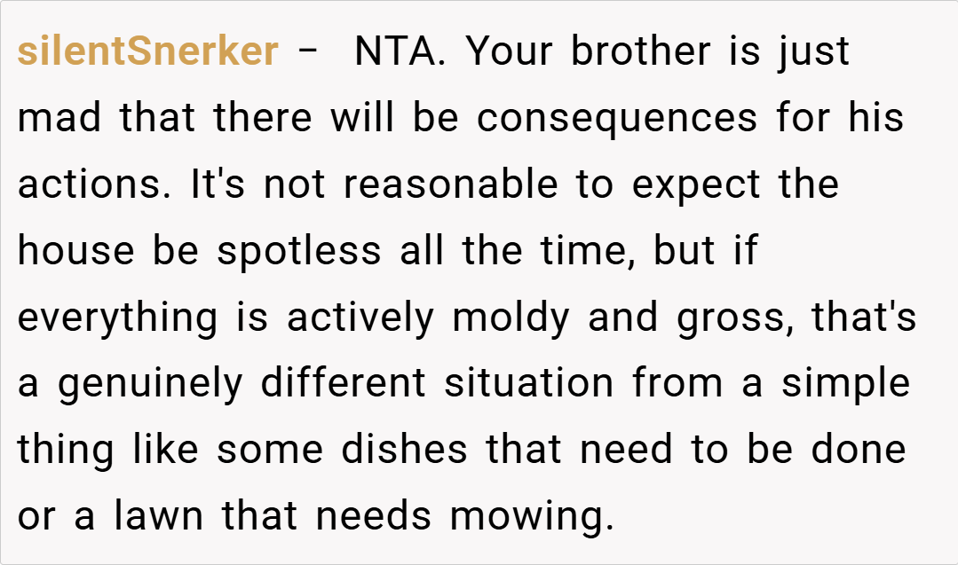 Several redditors expressed sympathy for the children’s reaction, with one user stating, “When you’re raised in an environment where responsibilities are neglected, it’s only natural for kids to lash out. You’re not the asshole for wanting your children to voice their frustration.”