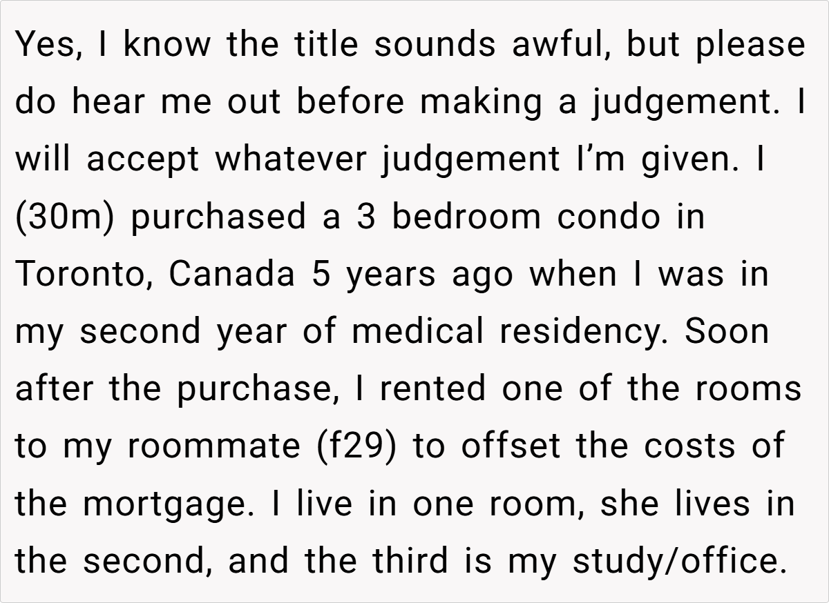 In a situation that raises questions about boundaries, responsibilities, and the nature of landlord-tenant relationships, a man finds himself facing backlash after deciding to evict his tenant because she is having a baby. The OP, a 30-year-old medical resident, has rented a room in his condo to a 29-year-old woman for several years. While their living arrangement has been amicable, the news of her pregnancy prompts the OP to reassess their situation.