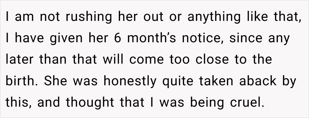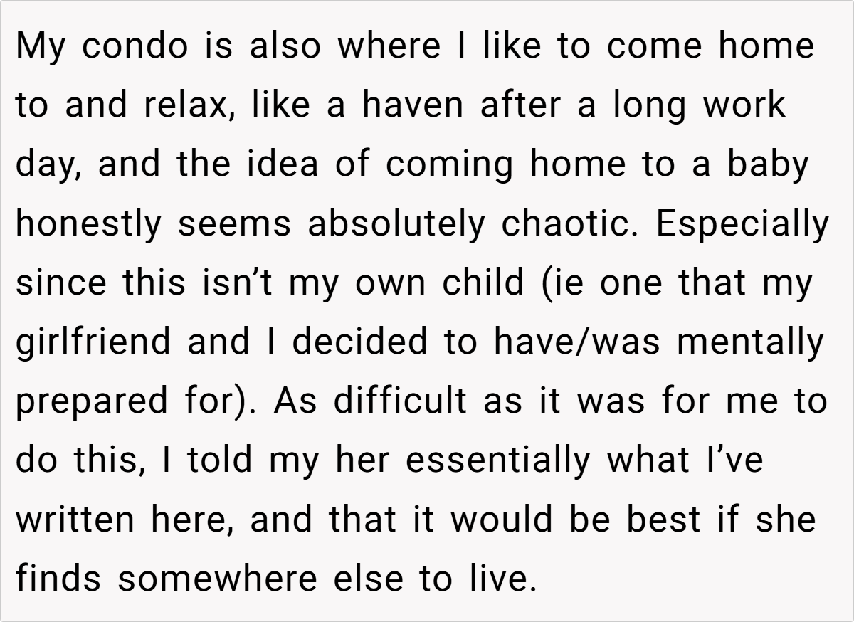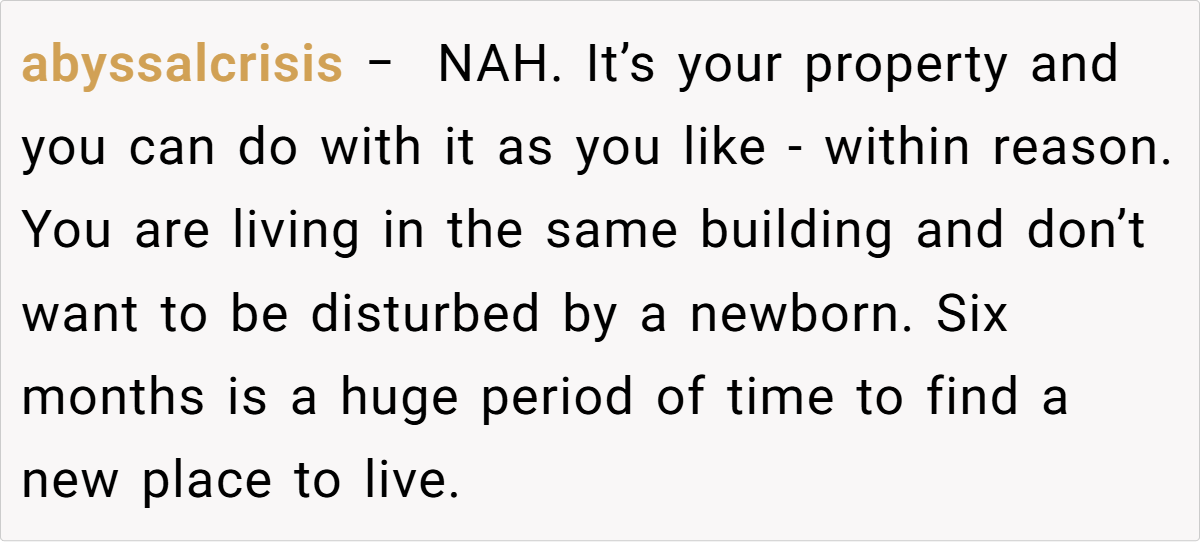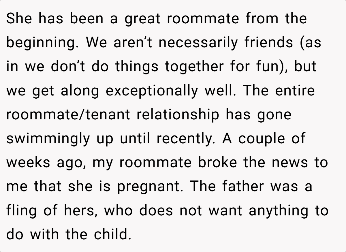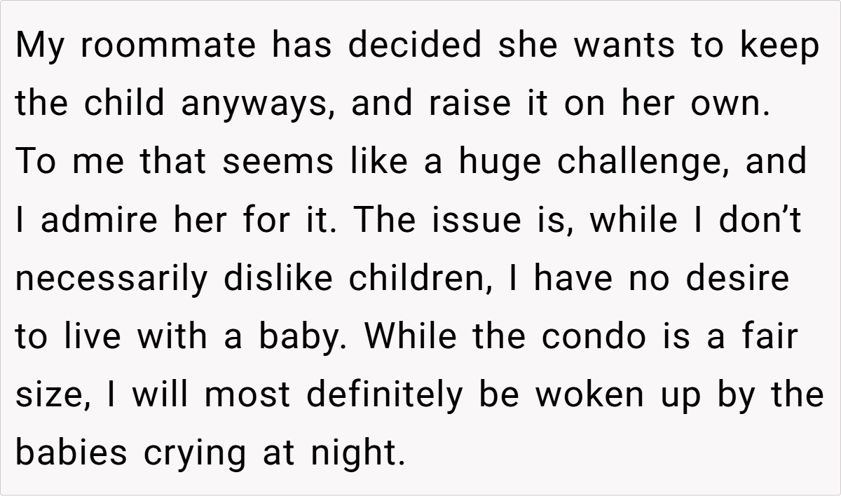 The OP explains that he has enjoyed a good roommate relationship with the young woman, but the prospect of living with a newborn—especially one that is not his—does not sit well with him. He acknowledges the challenges of raising a child and admires her decision to keep the baby, but he expresses a clear preference for maintaining his peaceful living environment, which he fears will be disrupted by a crying infant. After discussing the matter with her, he gives her a six-month notice to find new accommodations, which she views as cruel.