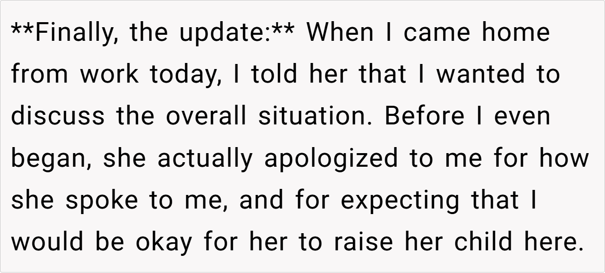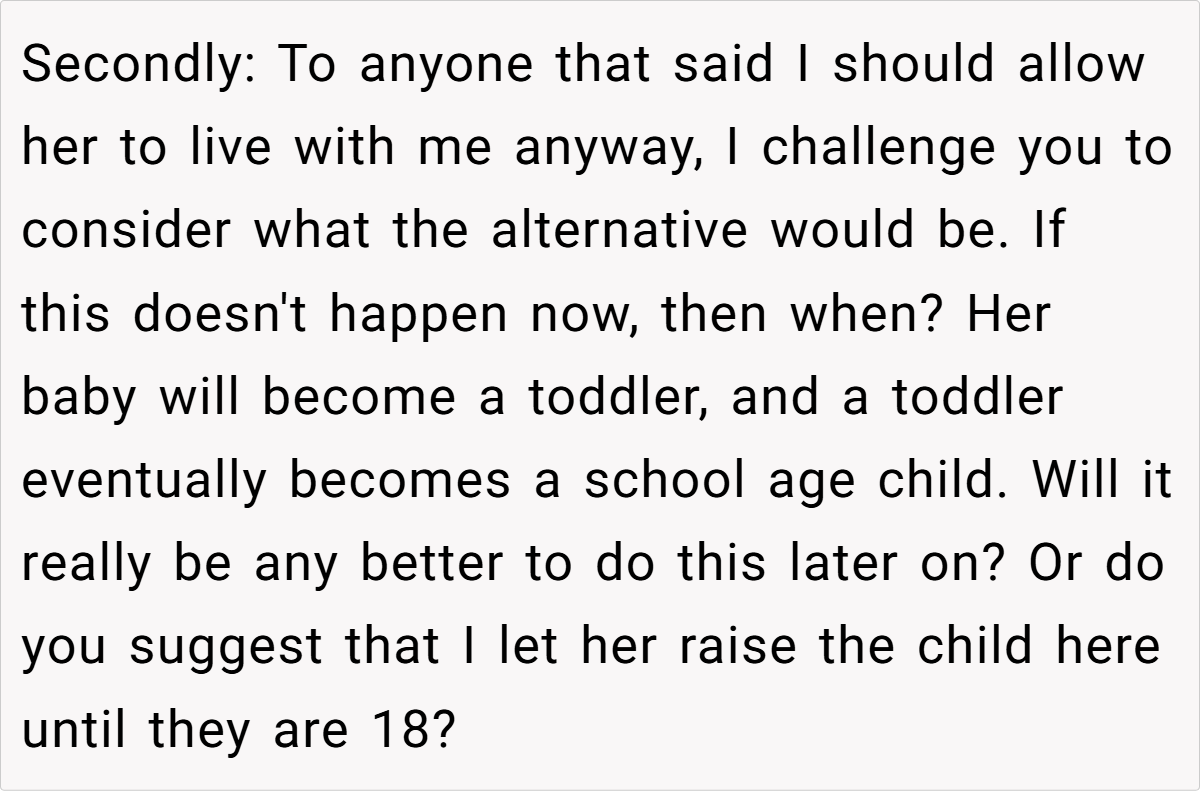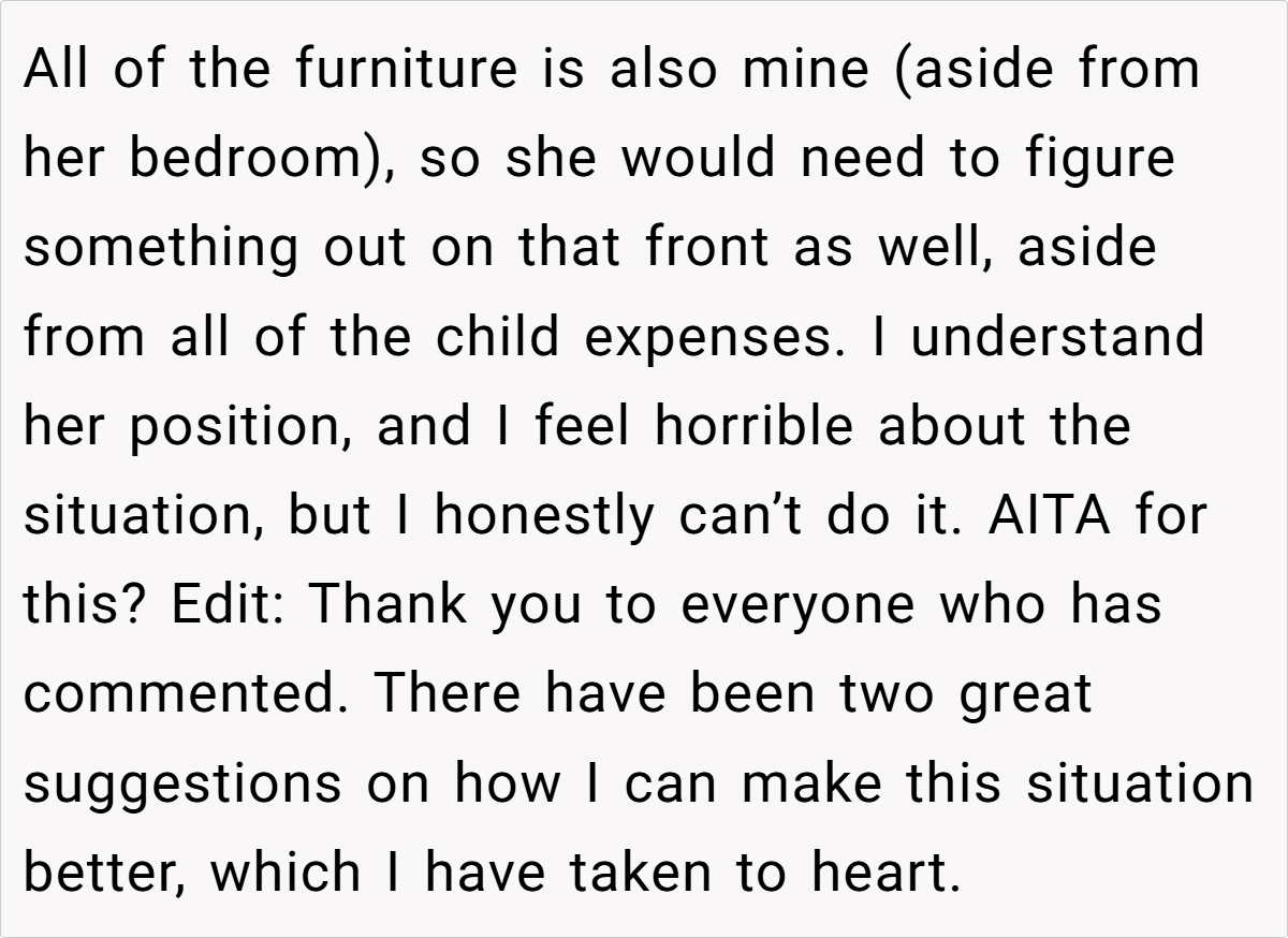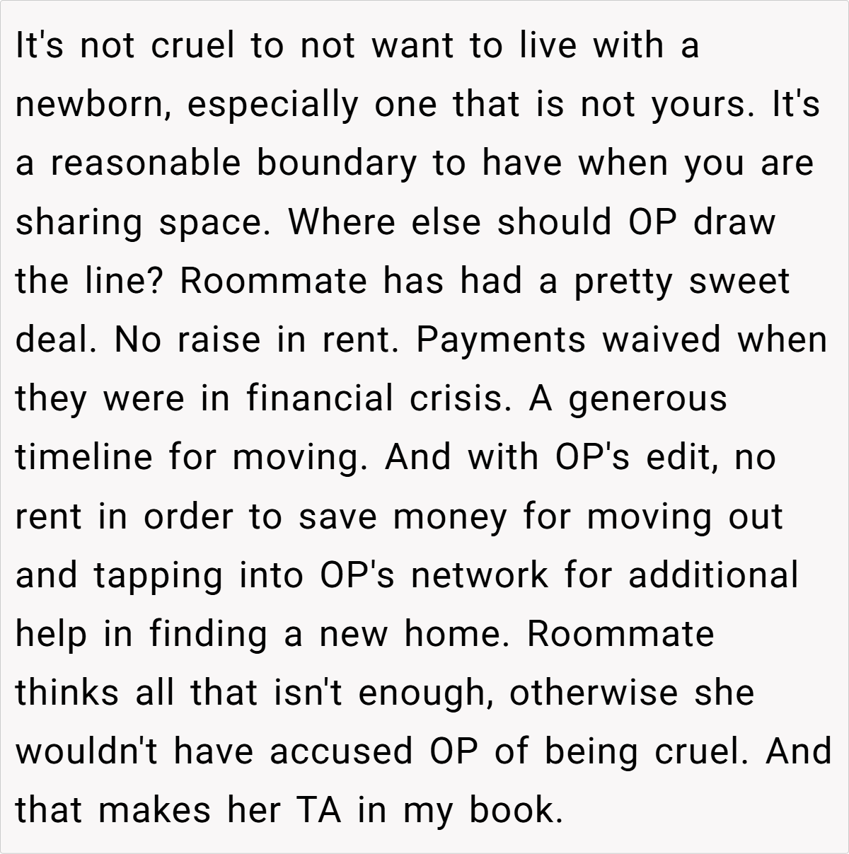The OP explains that he has enjoyed a good roommate relationship with the young woman, but the prospect of living with a newborn—especially one that is not his—does not sit well with him. He acknowledges the challenges of raising a child and admires her decision to keep the baby, but he expresses a clear preference for maintaining his peaceful living environment, which he fears will be disrupted by a crying infant. After discussing the matter with her, he gives her a six-month notice to find new accommodations, which she views as cruel.