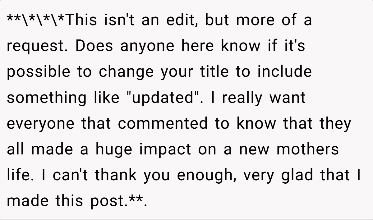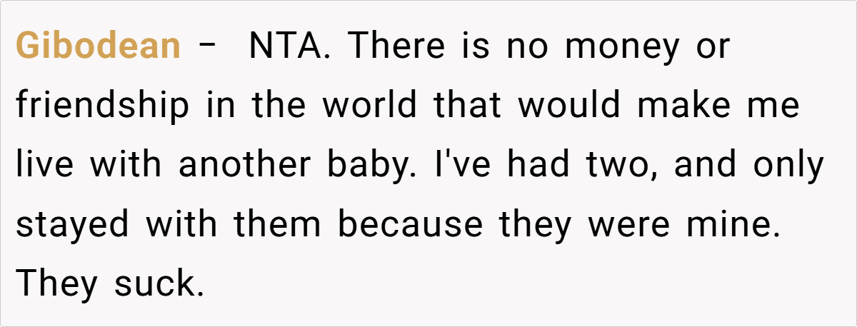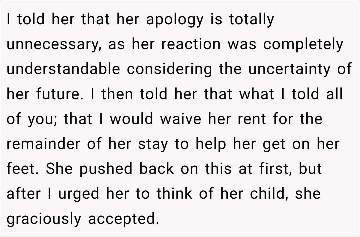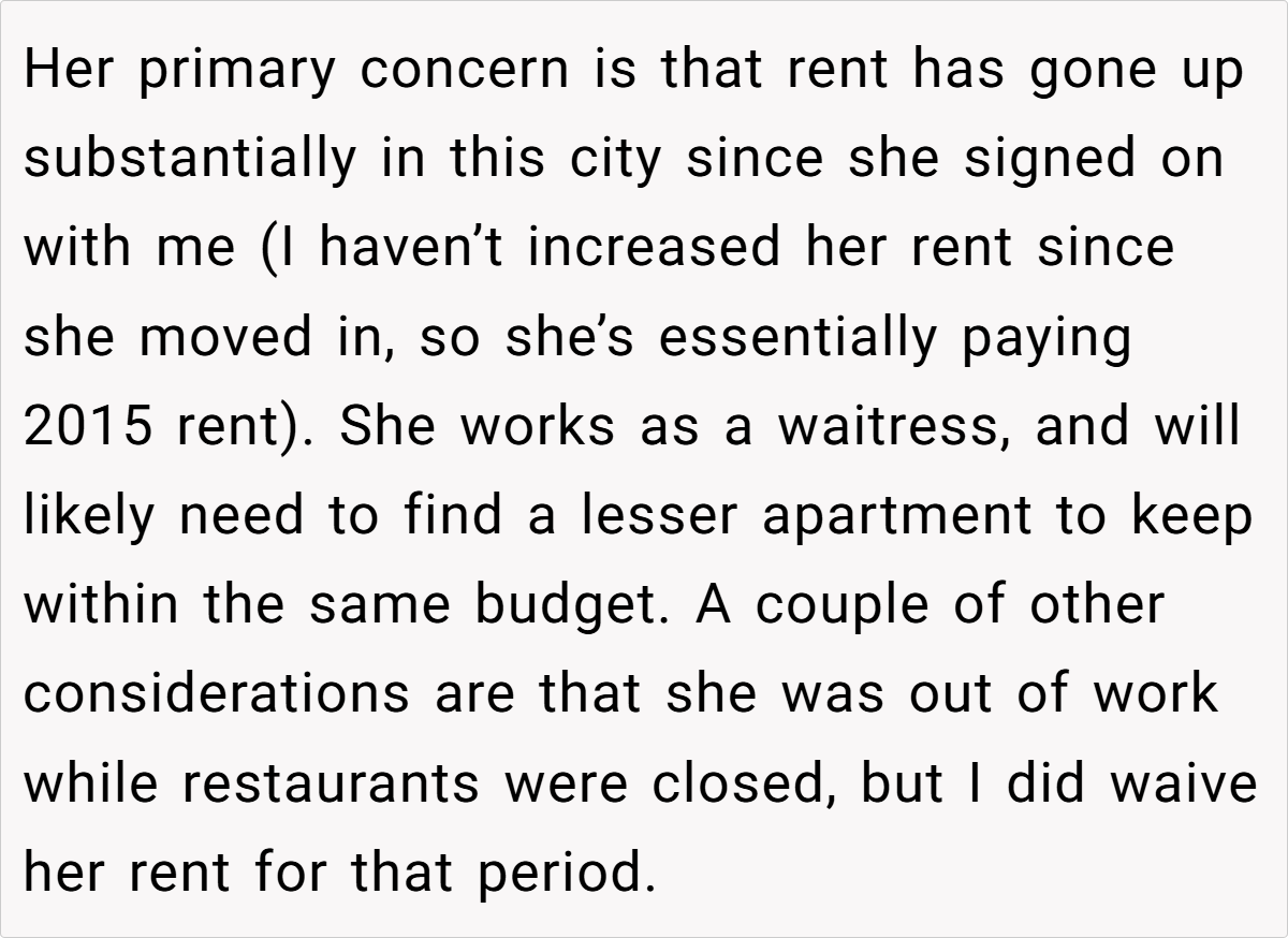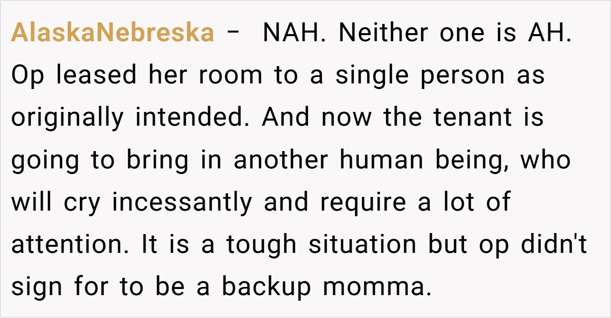 In his defense, the OP highlights that he has been accommodating in the past, waiving rent during difficult times and not increasing her rent despite rising market prices. He contemplates the impact of living with a baby on his own life and mental well-being.