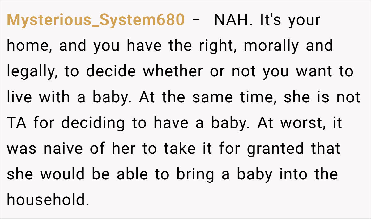 The consensus among community members is that the OP is not at fault for his decision. Many recognize that he has been accommodating and that his concerns about living with a newborn are valid. The discussion acknowledges the complexities of the situation without placing blame on either party.