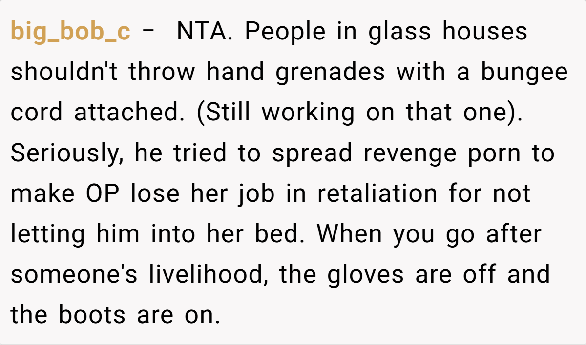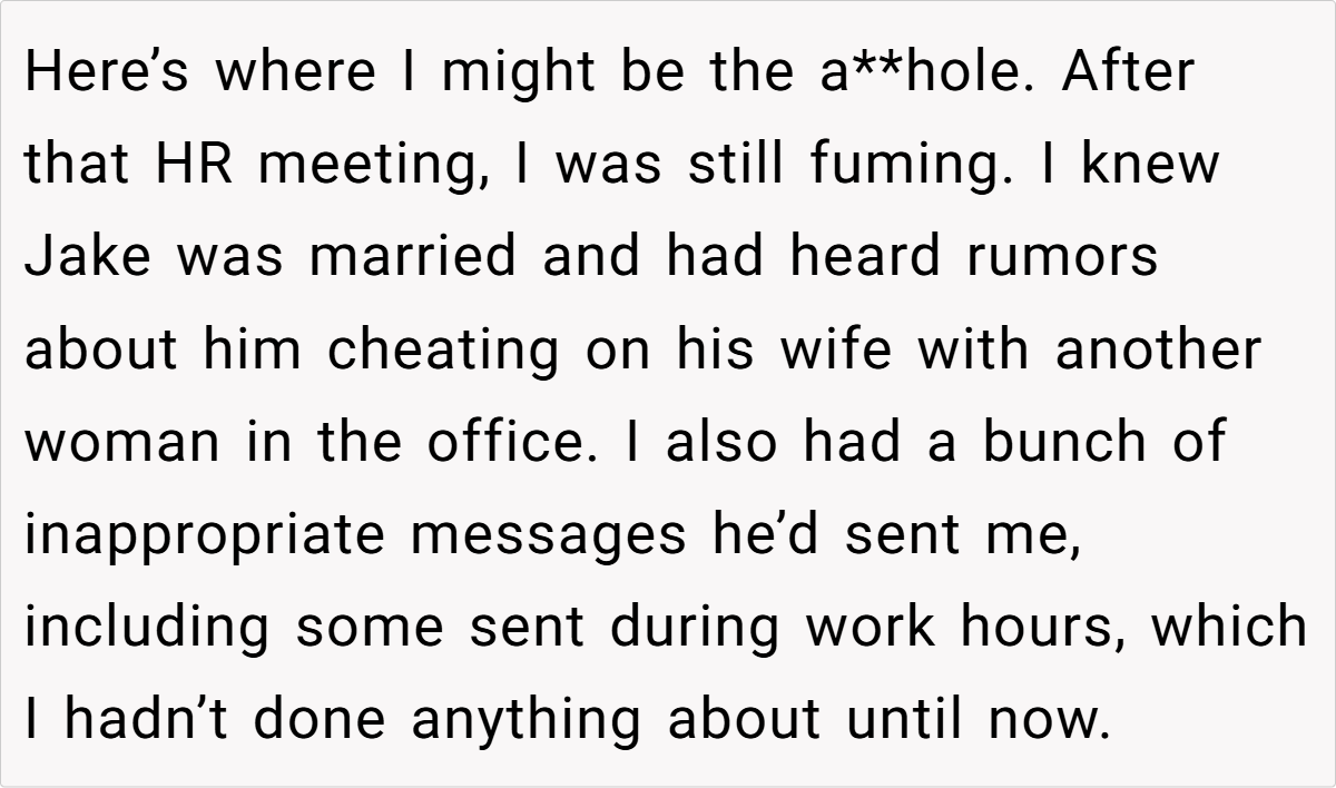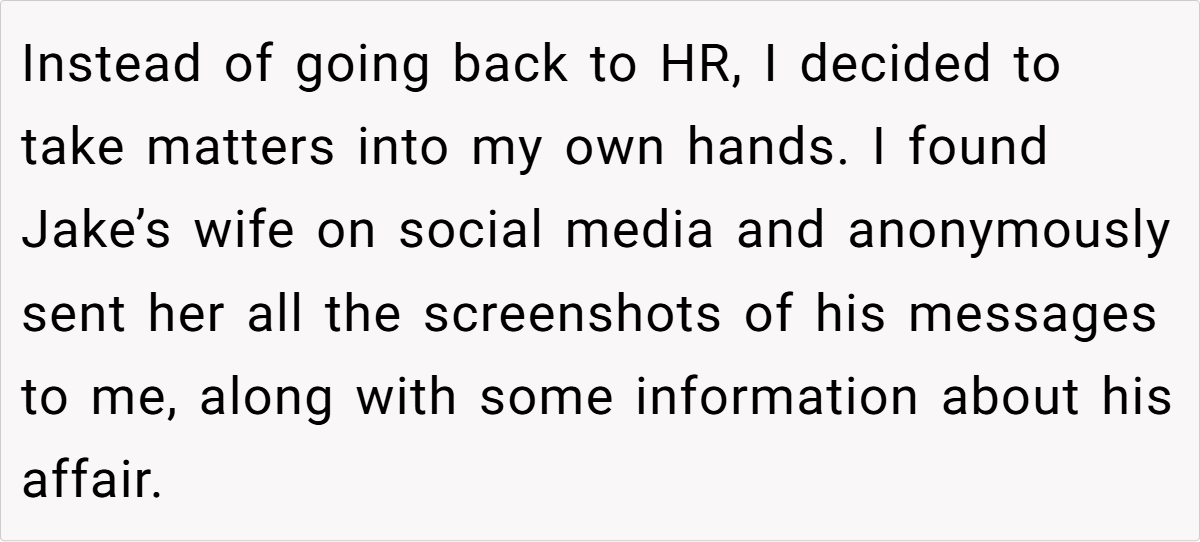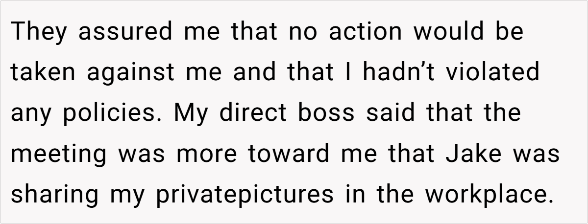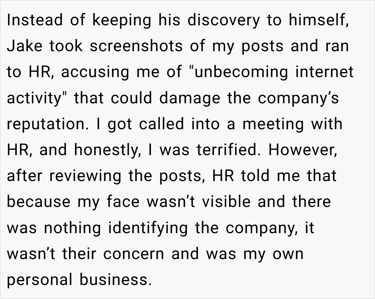 One aspect that stands out is the misuse of workplace power dynamics. By taking screenshots of private content and running to HR, Jake not only overstepped professional decorum but also weaponized personal information for his own gain. This abuse of trust reflects a broader issue in many modern workplaces, where personal biases and unresolved grievances often lead to harmful actions. Such behavior undermines both personal integrity and the collective trust necessary for a healthy work environment.