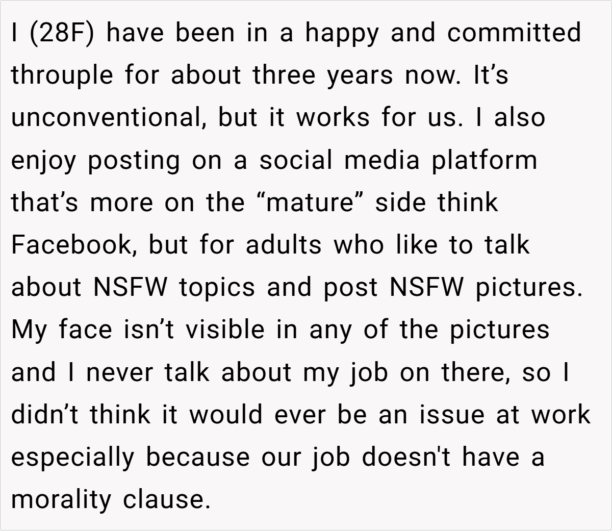 In the digital age, personal life and professional boundaries can easily collide in unexpected ways. One individual’s recent experience highlights just how messy things can get when the lines blur. Balancing a happy throuple, a discreet yet NSFW social media presence, and an unpredictable workplace, our protagonist finds herself at the center of a storm that no one saw coming. This modern drama draws you in with its mix of unconventional love and corporate conflict.