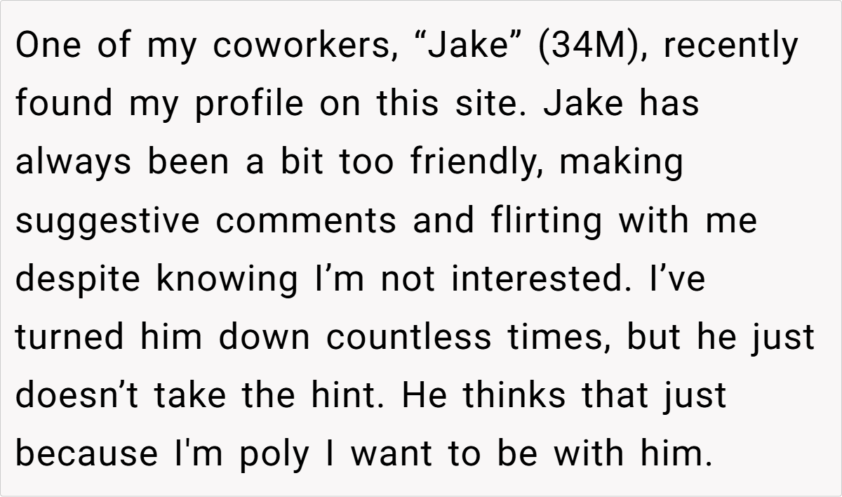 The situation is further complicated by the dynamics of non-traditional relationships. Being in a committed throuple defies societal norms yet works harmoniously for those involved. However, when personal boundaries are breached by someone like Jake—whose unwanted advances turned into a full-blown HR issue—the workplace atmosphere quickly turns toxic.