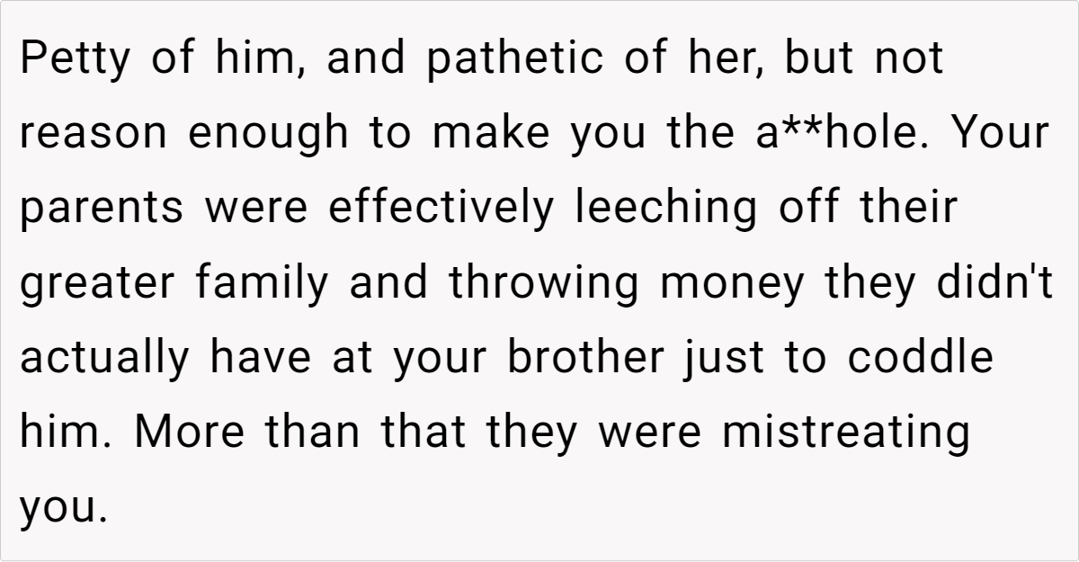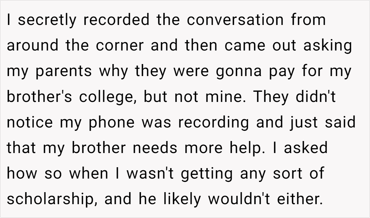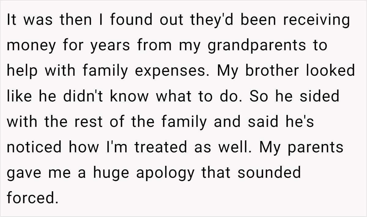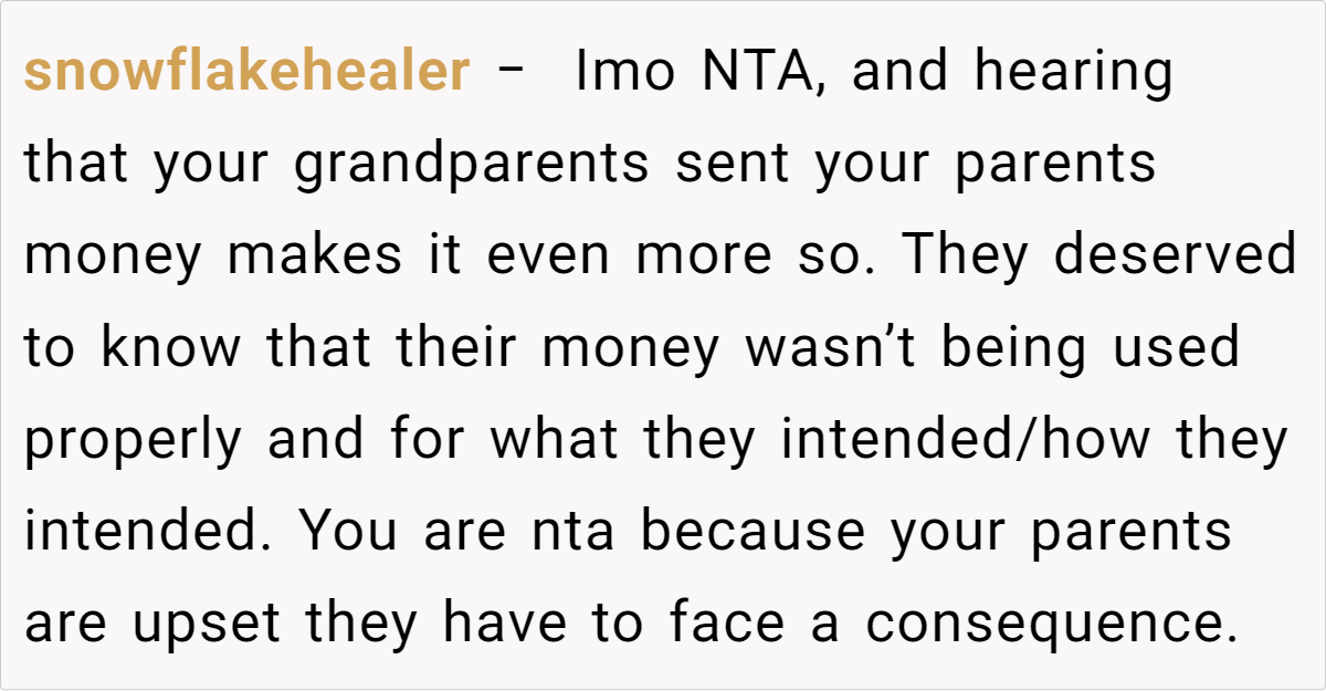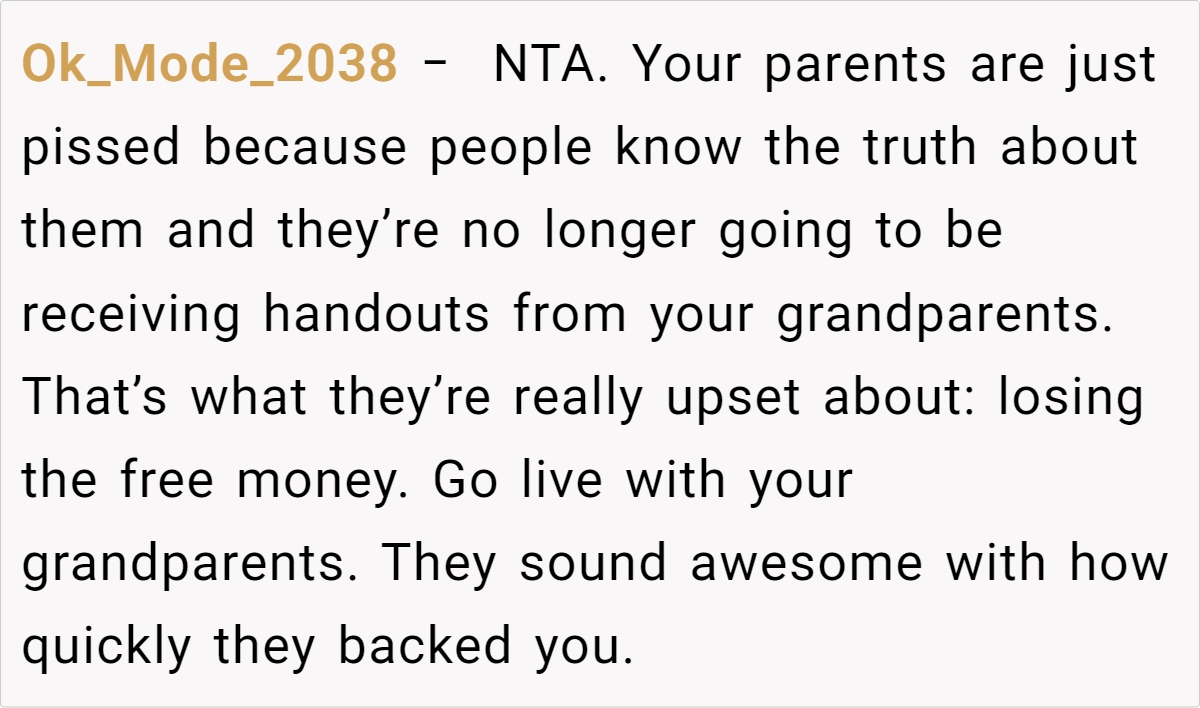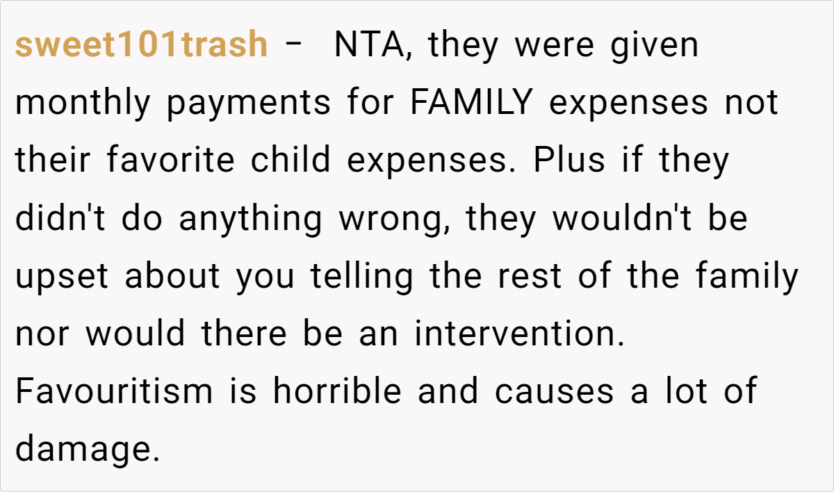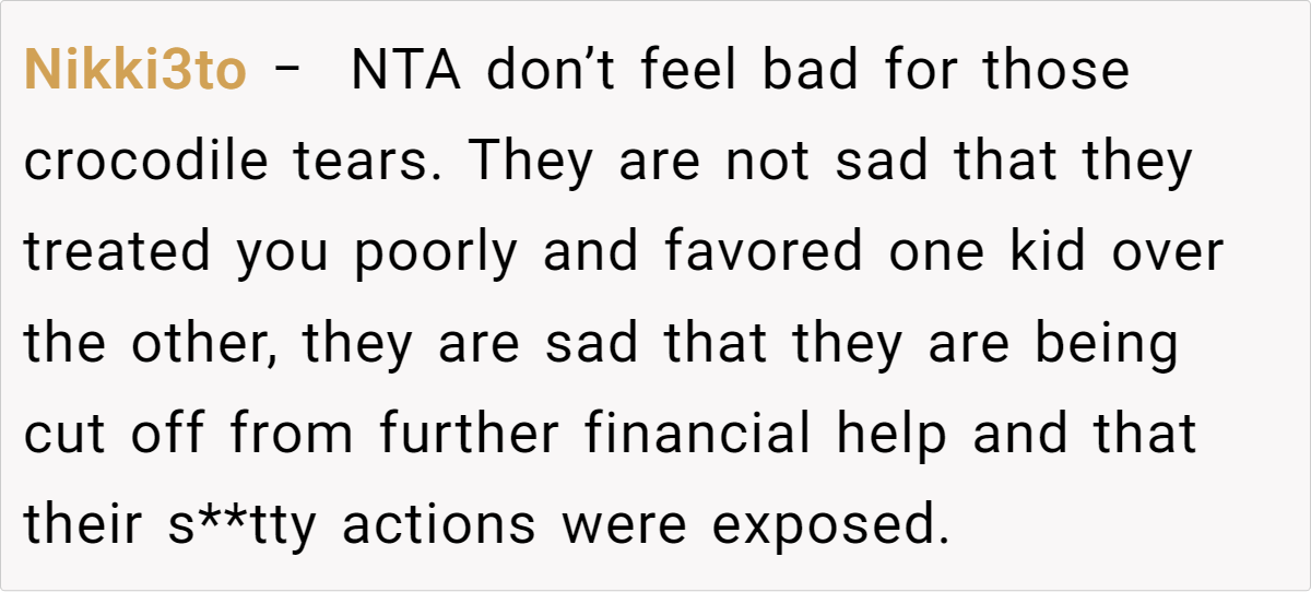 Reddit’s verdict is resounding: NTA. Users like u/Ok_Mode_2038 argue the parents’ anger stems from losing grandparental funds, not remorse. Others, like u/chloe_liked_olivia, commend the family’s swift intervention: “They shattered their own facade.” A minority critique the recording tactic, but most agree: “Favoritism thrives in silence.”