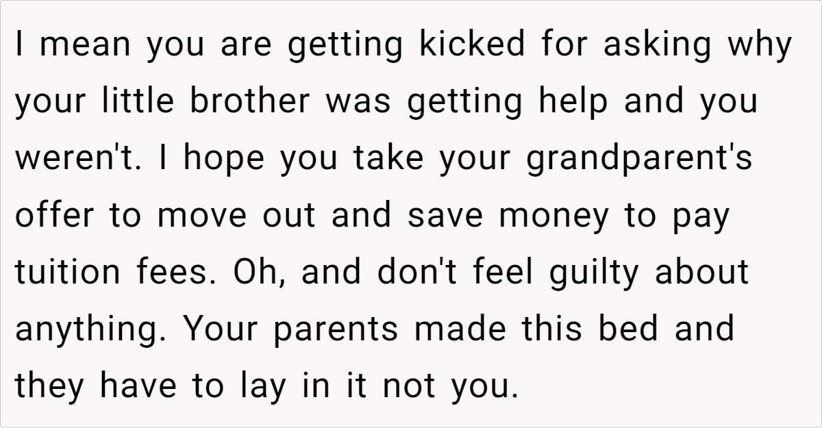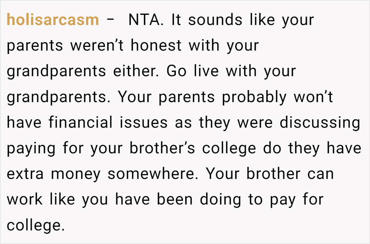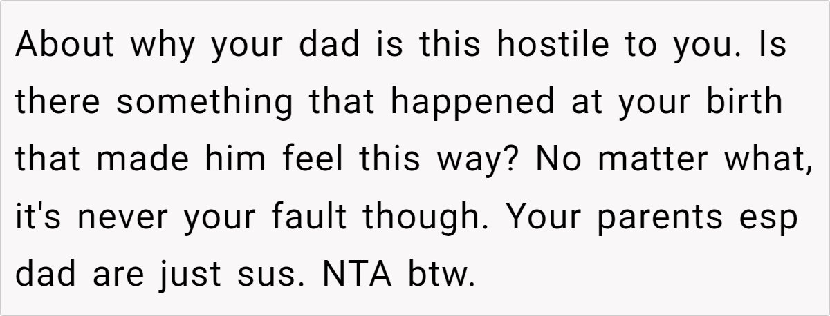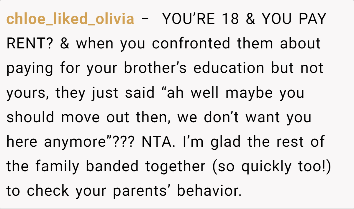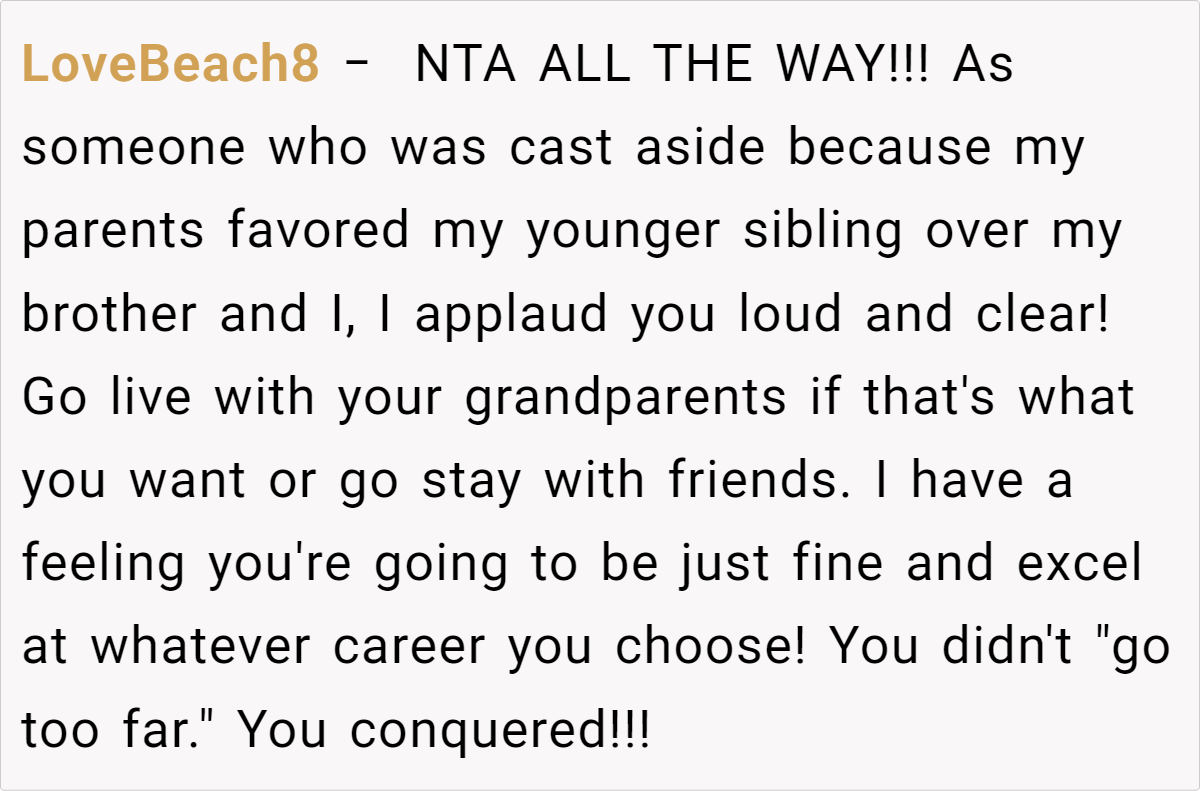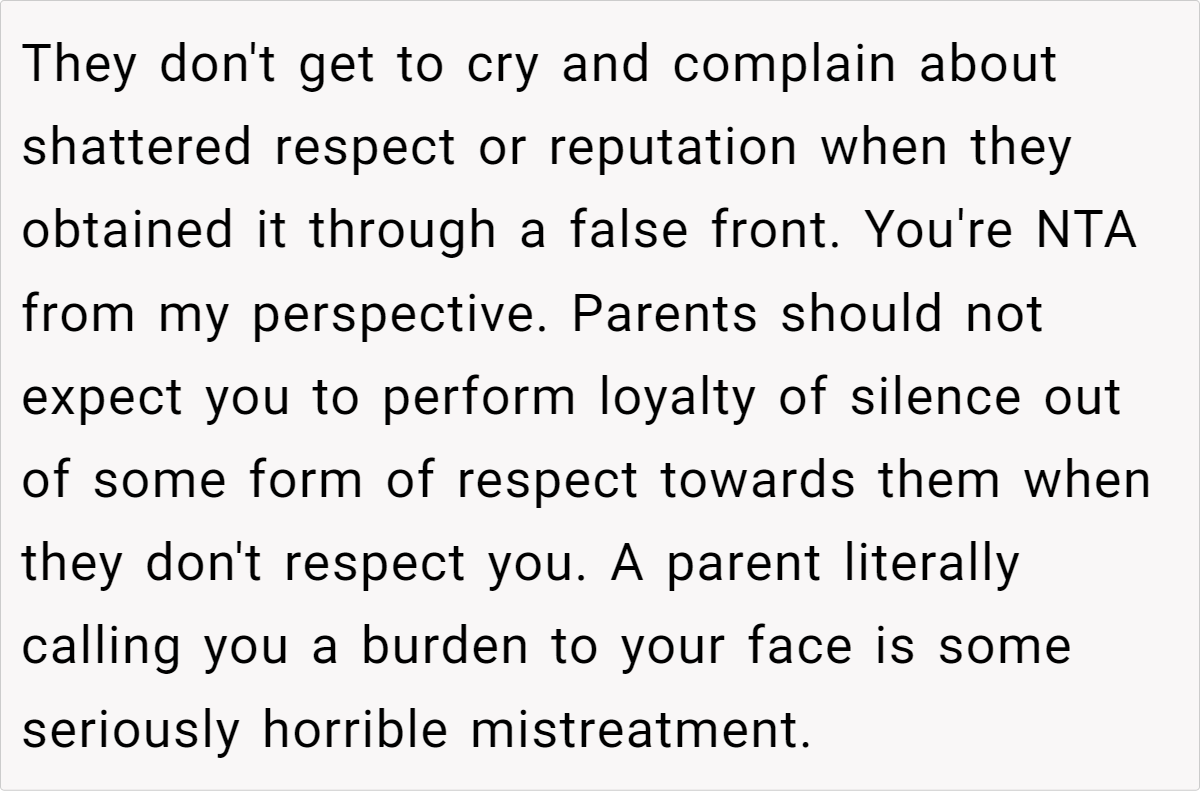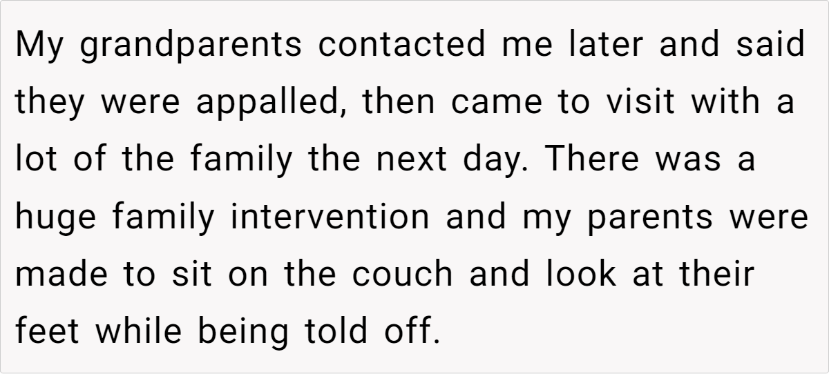 Reddit’s verdict is resounding: NTA. Users like u/Ok_Mode_2038 argue the parents’ anger stems from losing grandparental funds, not remorse. Others, like u/chloe_liked_olivia, commend the family’s swift intervention: “They shattered their own facade.” A minority critique the recording tactic, but most agree: “Favoritism thrives in silence.”