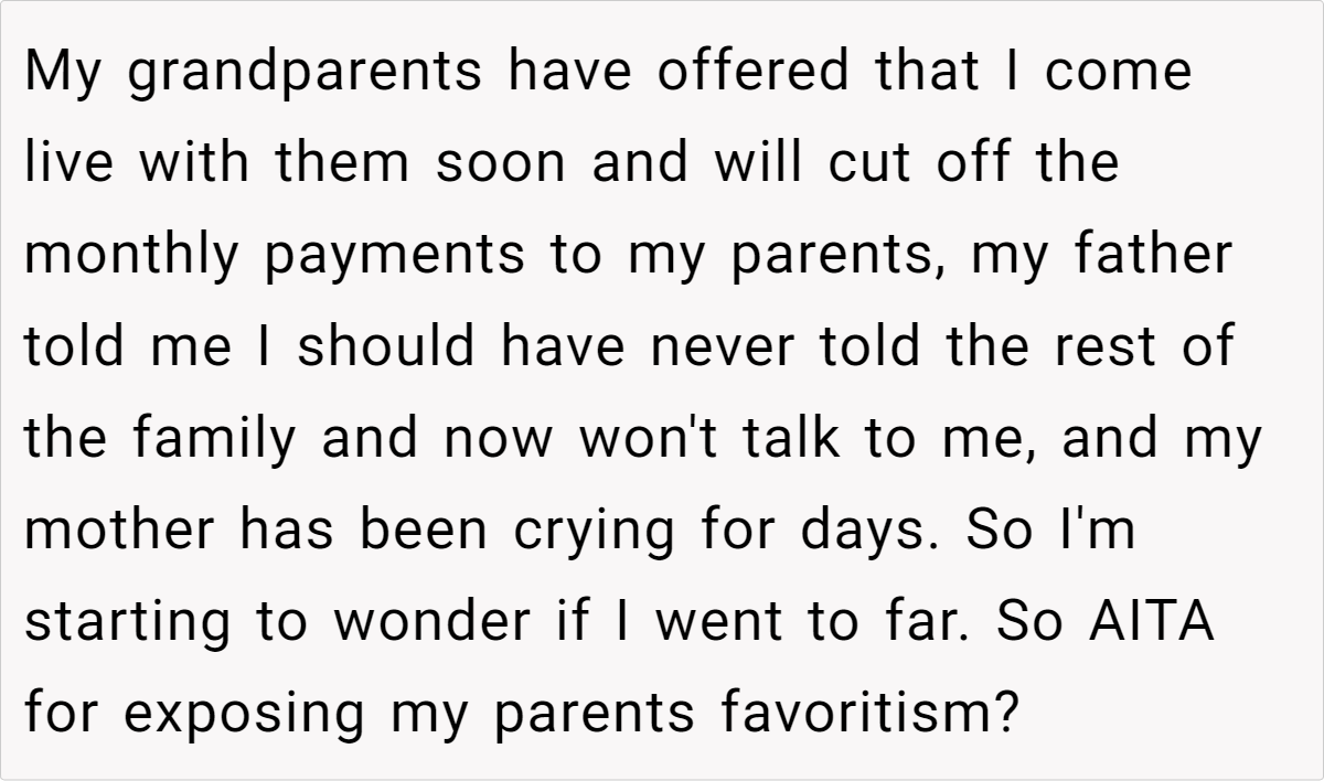 For those who want to read the sequel: UPDATE AITA for exposing my parents’ favoritism