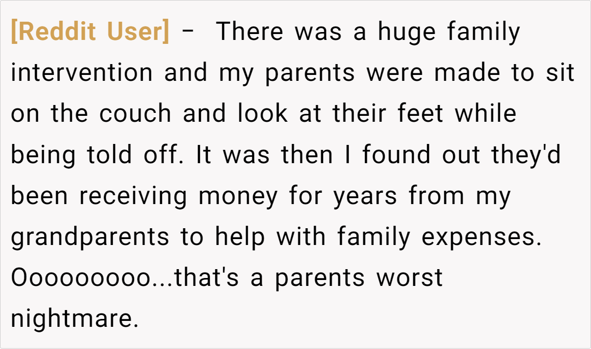 The revelation that grandparents funded the parents adds layers to the conflict. Financial therapist Lindsay Bryan-Podvin notes, “Money designated for ‘family expenses’ used selectively breaches trust. It’s a form of financial infidelity.” Pew Research reports that 34% of families providing financial support to adult children face tension over unequal distributions.