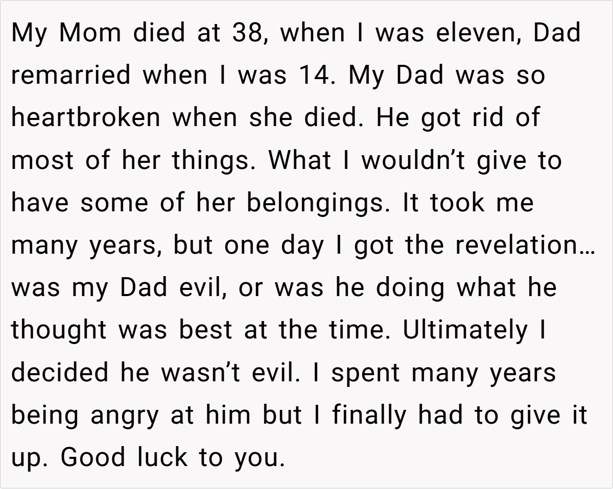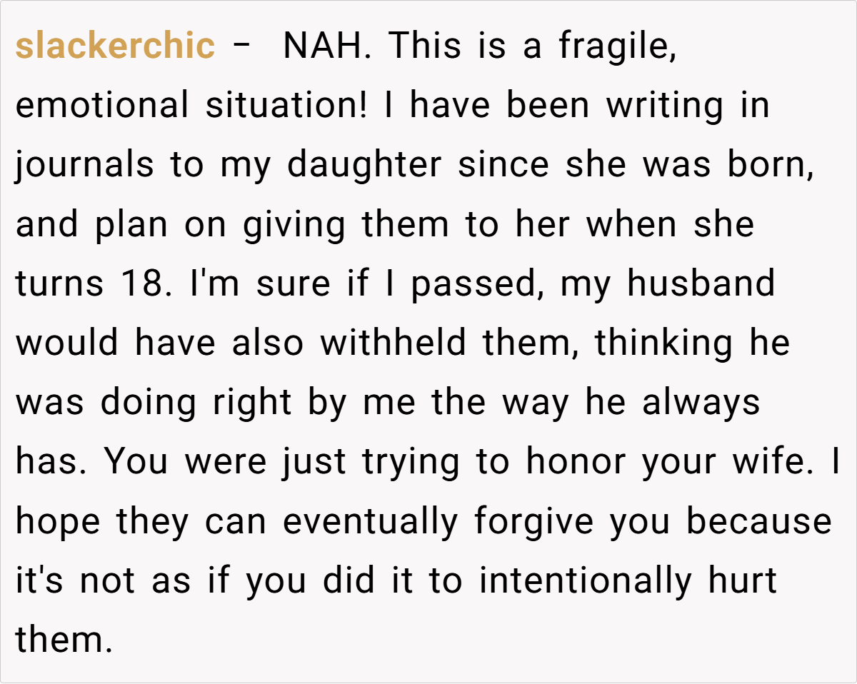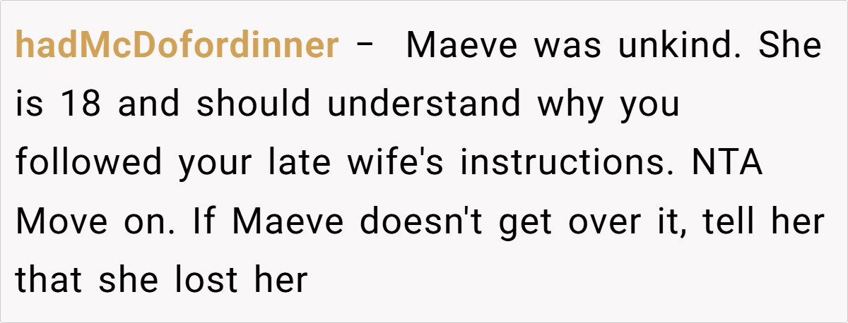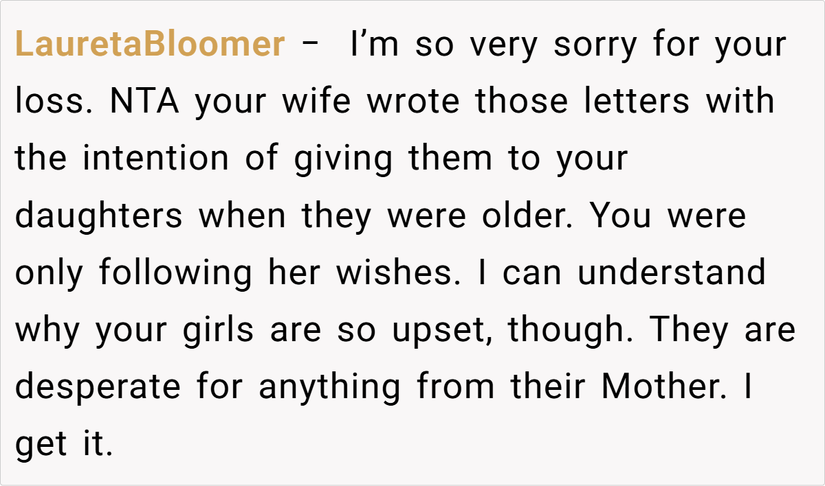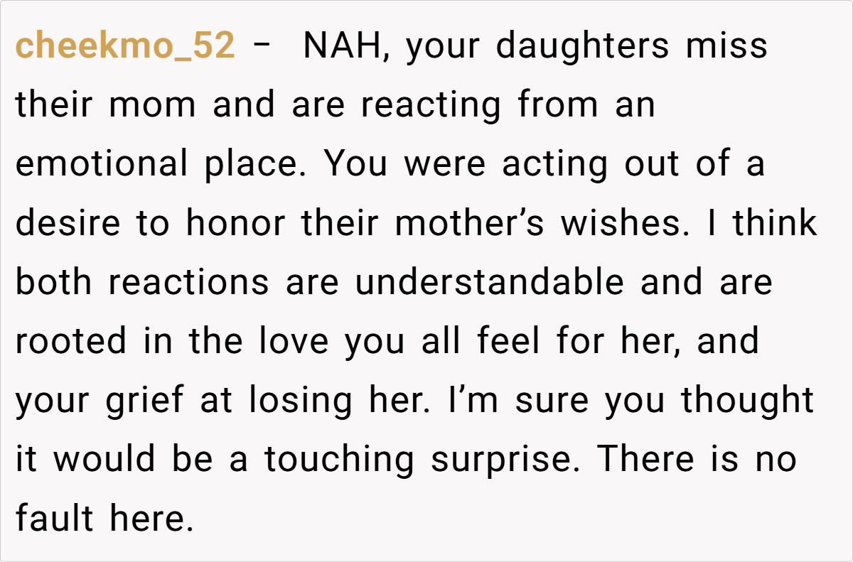 Navigating the labyrinth of grief is never straightforward, and this situation exemplifies how well-intended actions can sometimes backfire. The father, caught between honoring his late wife’s explicit instructions and responding to his daughters’ emotional needs, finds himself in an agonizing bind. His desire to maintain her legacy conflicts with the immediate yearning for maternal comfort, reflecting a broader struggle faced by many grieving families.