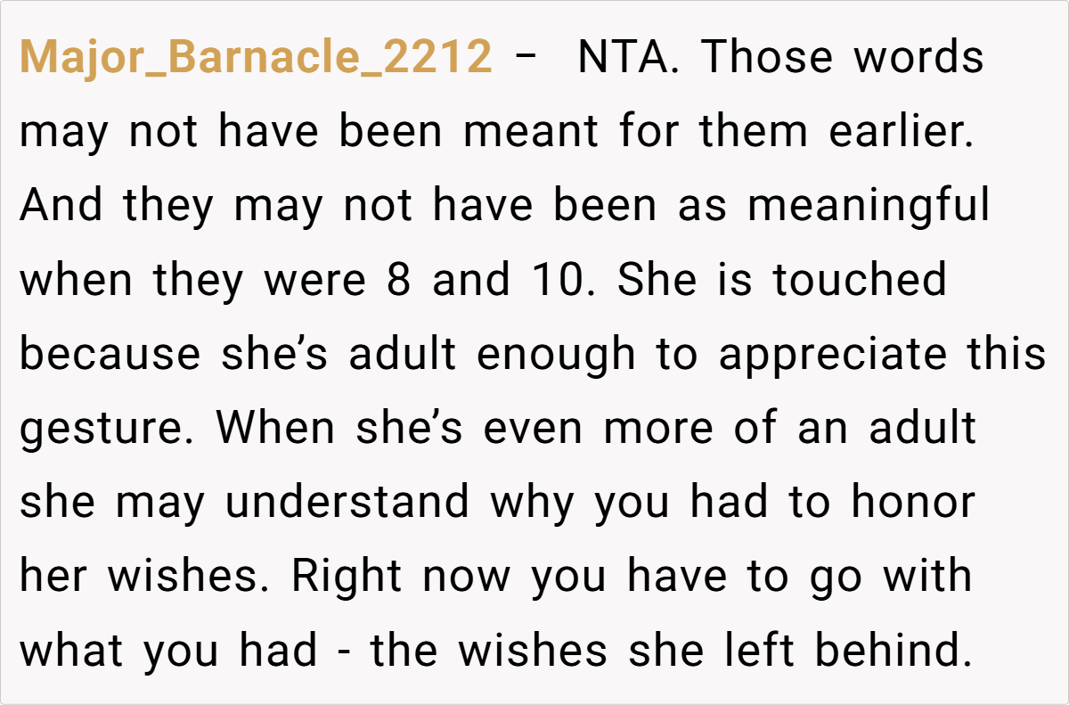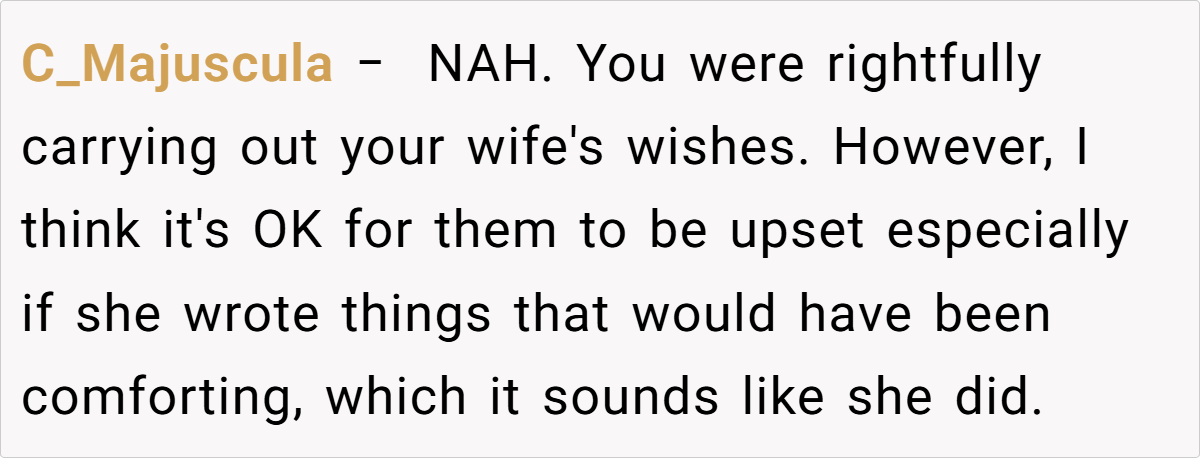 Here are some hot takes from the Reddit community—candid, heartfelt, and tinged with the bittersweet humor that often emerges in shared grief. The comments capture a range of emotions, from understanding to gentle reproach, as redditors weigh in on whether following the late wife’s precise instructions was truly the right move.