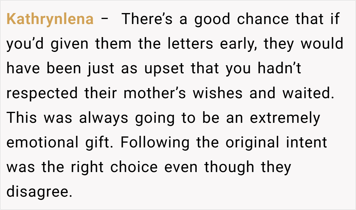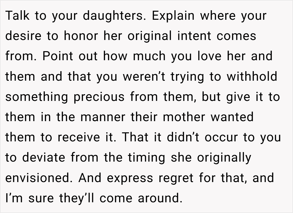 In light of these complexities, it is essential for families in mourning to foster open dialogue and adjust rituals to meet current emotional needs. The father’s choice, though rooted in respect for his wife’s wishes, highlights the need for sensitivity in timing and delivery when it comes to healing gestures. Practical approaches may involve gently explaining the original intent behind the timing while also validating the immediate emotional pain felt by the daughters. Balancing legacy with empathy can transform a rigid plan into a more compassionate process.