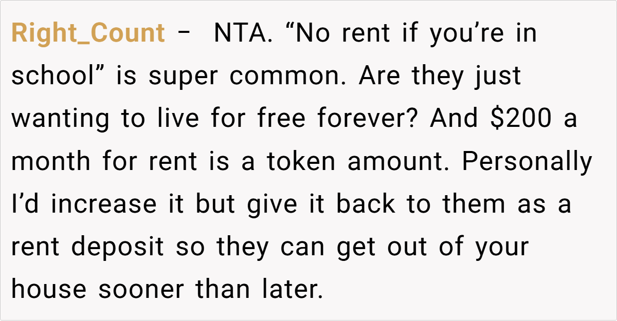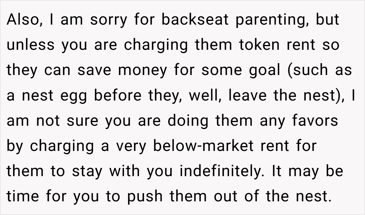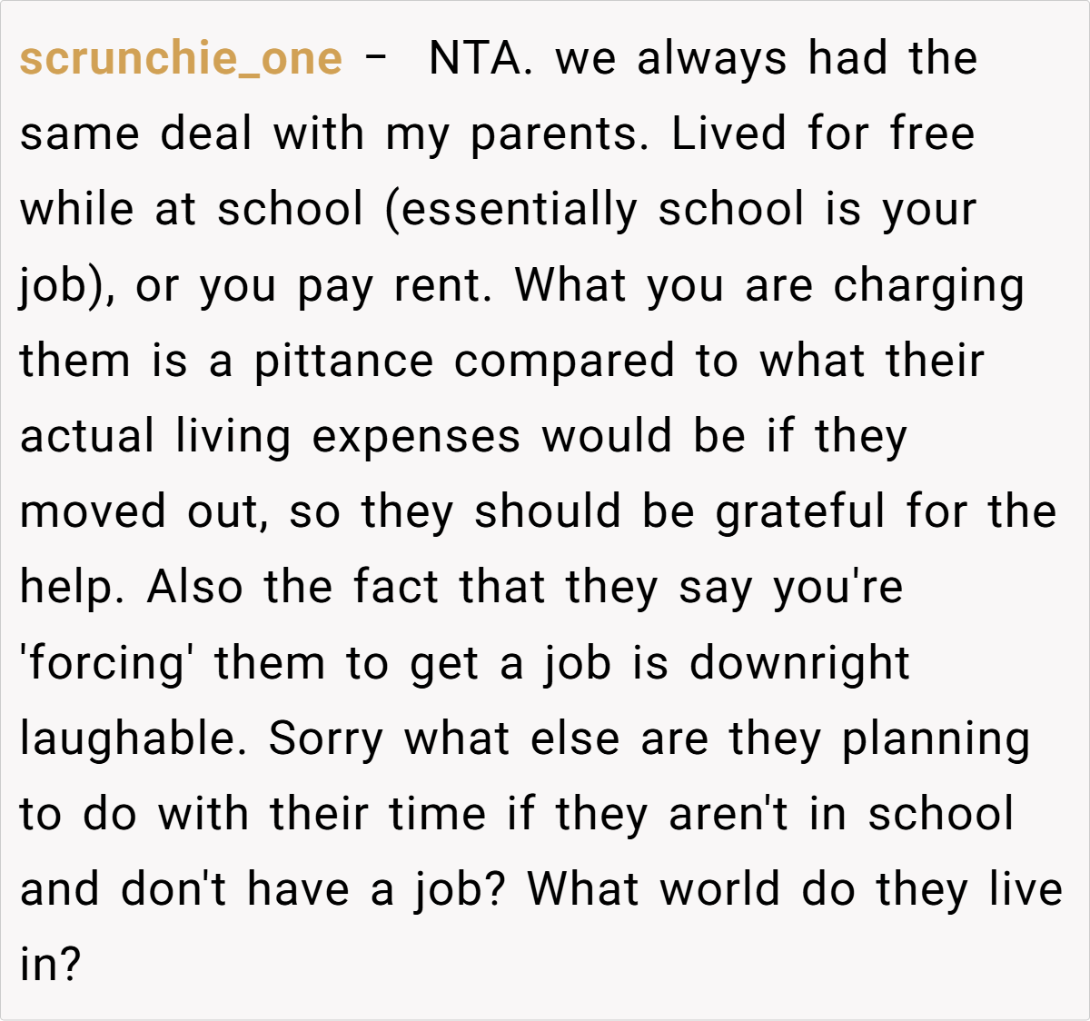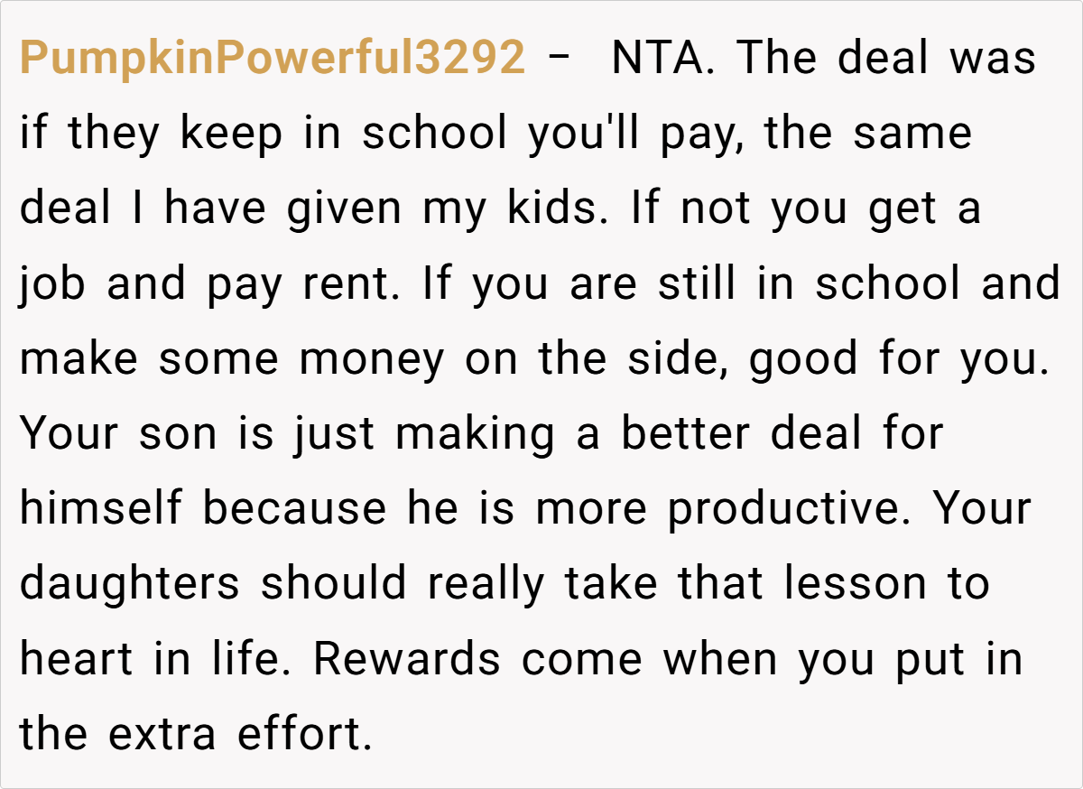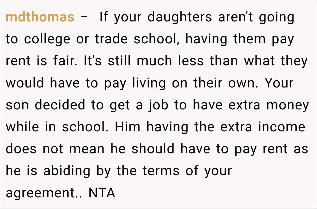 Across the board, many Redditors feel that the parent’s decision is fair, given the clear terms set from the beginning. Some argue that the daughters’ grievances stem more from regret over their choices than any real injustice. Others suggest that if they believe the arrangement is unfair, they should consider alternative living situations to foster greater independence. The overall sentiment is one of support for the idea that personal choices come with corresponding responsibilities.