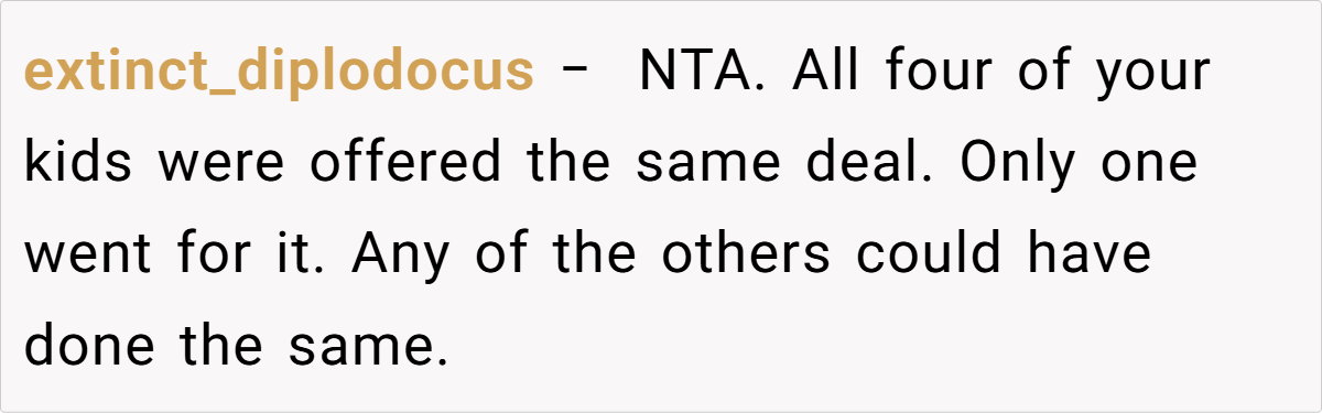 This family tale poses an interesting question: How do we balance parental promises with the evolving realities of adult life? The parent’s clear rules set long ago have now led to a situation where choices dictate responsibilities, yet feelings of inequality still emerge. What do you think—is it fair to reward the decision to pursue higher education with full support, even if it means asking others to contribute financially? Share your thoughts and experiences—how would you handle such a scenario in your family?
