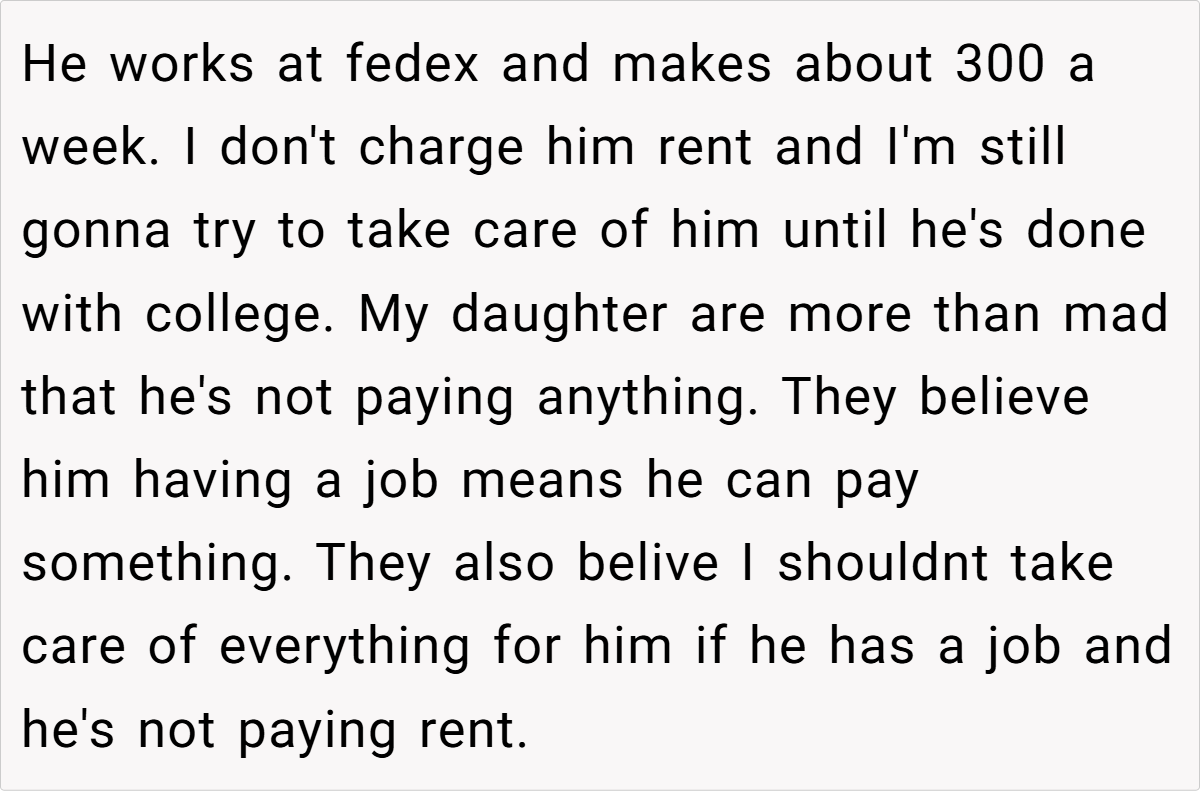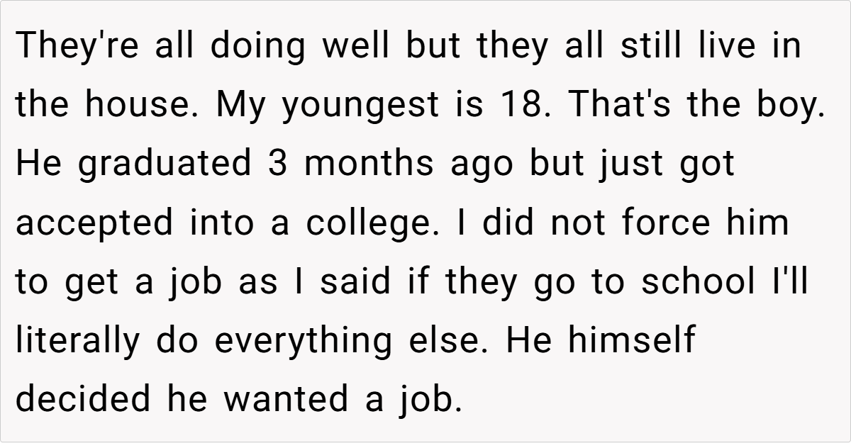 In a household where family rules were set from a young age, one parent’s decision has sparked a debate about fairness and responsibility. The story centers around a parent who promised to cover all expenses if their children pursued higher education. However, when three of the children—three daughters—chose not to attend college, they were asked to secure jobs and contribute a modest rent of $200 a month.