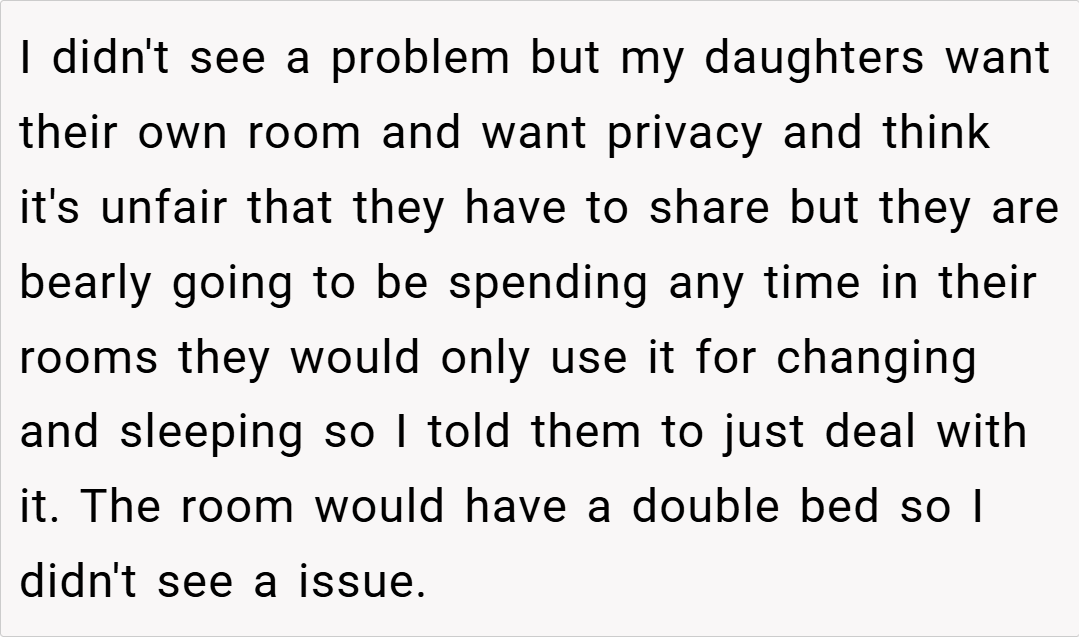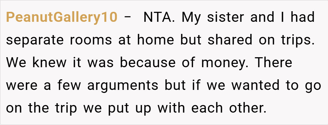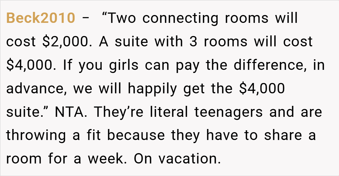 Many redditors empathize with the OP’s perspective, stating that vacations are expensive and practical decisions about accommodations shouldn’t be taken lightly. “If you’ve budgeted for one room for the girls and it meets their needs, you’re not the asshole for sticking to that plan,” one commenter noted.