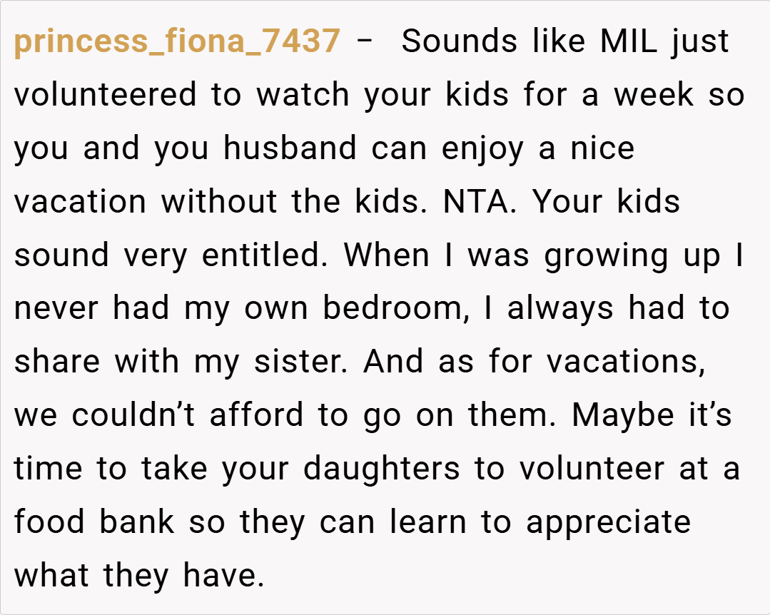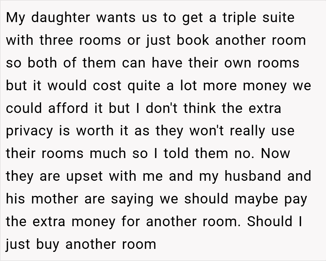 OP, however, firmly declined to spend extra money for additional privacy, believing that the current arrangement was practical and sufficient for the trip. Now, with her daughters upset and even her husband’s mother suggesting they should reconsider, OP wonders if she’s in the wrong.