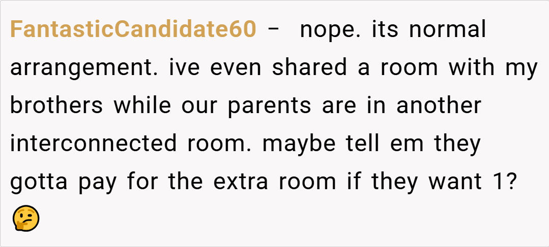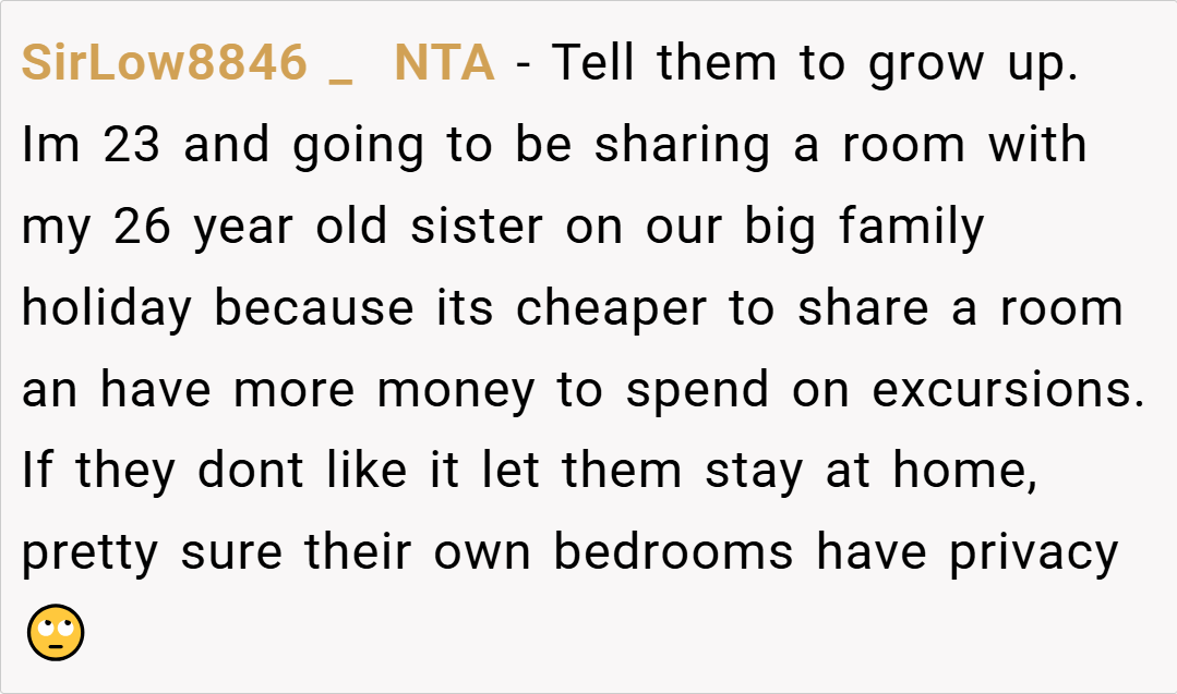 While it’s understandable that teenagers crave privacy, the reality of the vacation schedule and financial considerations make the current setup reasonable. Do you think it’s fair for parents to prioritize practicality over teenage demands for privacy, or should family vacations always aim to cater to every individual’s ideal scenario? Share your thoughts and experiences in the comments below—what would you do if you found yourself in a similar situation?