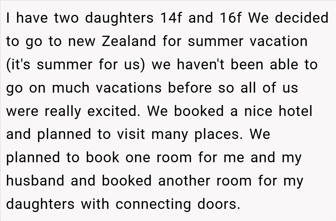 The plan was simple: one hotel room for the parents and another room with connecting doors for the daughters. While OP saw no issue—given that the girls would only use the room for changing and sleeping—her daughters demanded their own space and privacy. They argued that sharing a room was unfair, and one daughter even proposed upgrading to a triple suite or booking an additional room at extra cost.