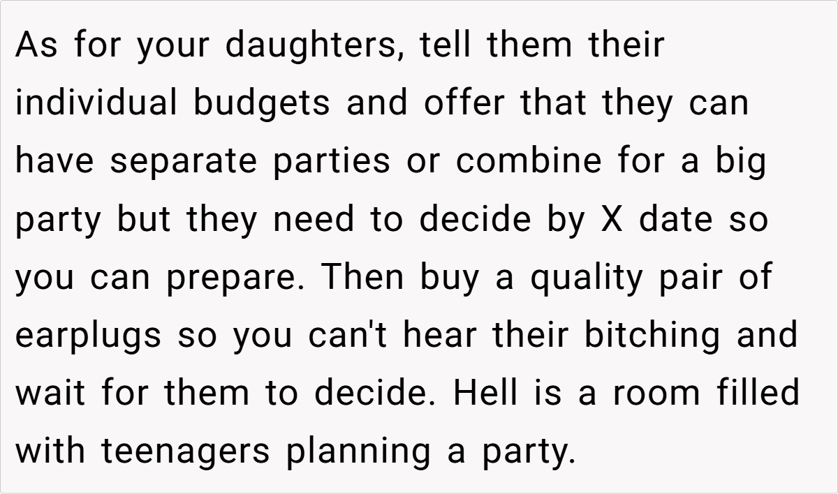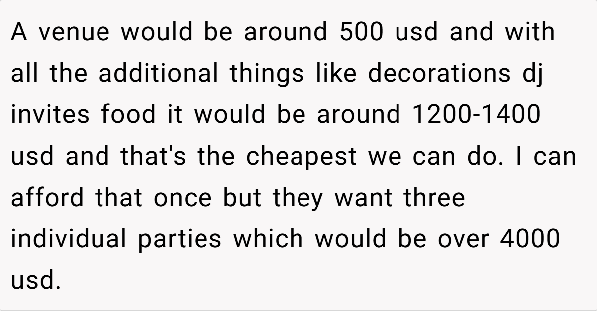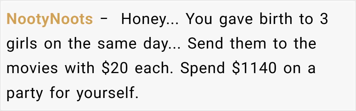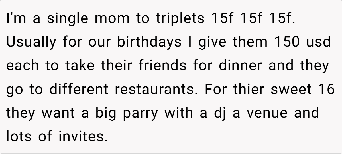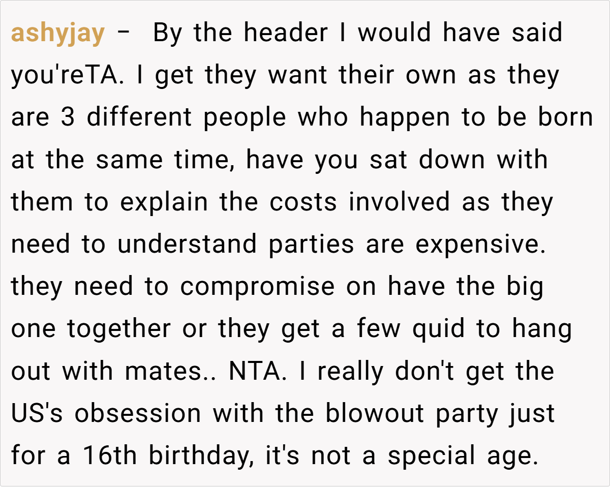 In summary, the Reddit community overwhelmingly sides with the mom. Commenters argue that while it’s understandable for teenagers to dream of a lavish party, expecting three separate events is unrealistic. Many believe that if the triplets want more money or extra perks, they should learn to earn it themselves—perhaps by taking up part-time jobs or contributing to the planning process.