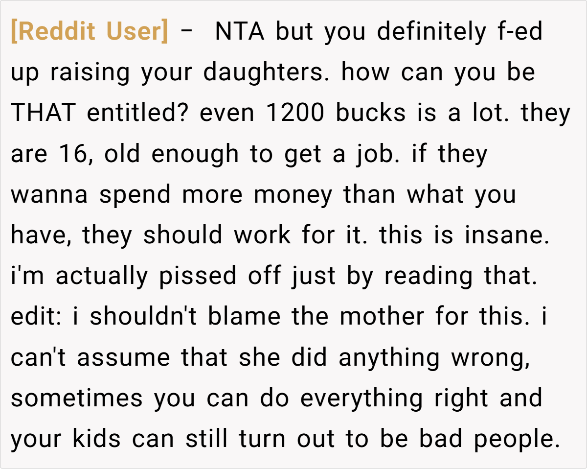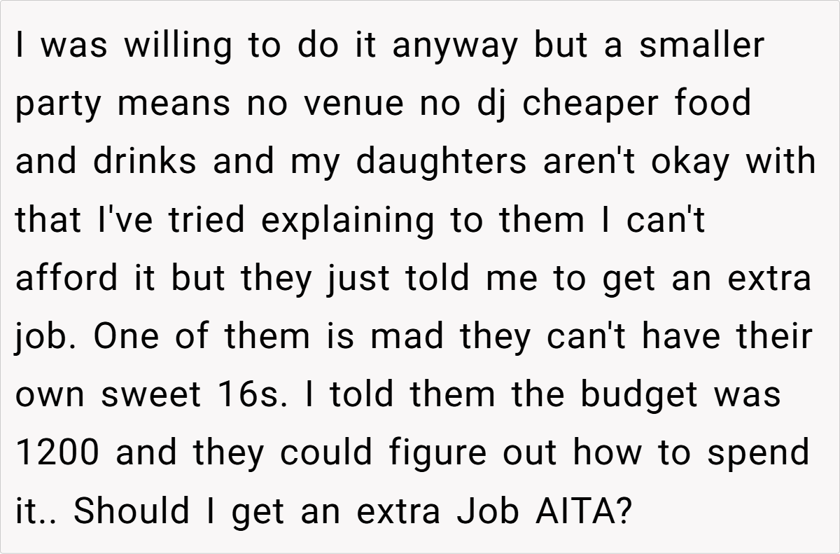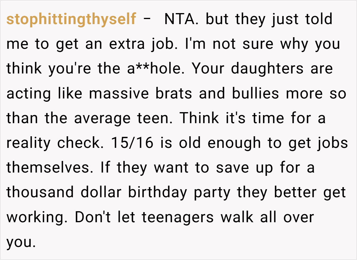 In summary, the Reddit community overwhelmingly sides with the mom. Commenters argue that while it’s understandable for teenagers to dream of a lavish party, expecting three separate events is unrealistic. Many believe that if the triplets want more money or extra perks, they should learn to earn it themselves—perhaps by taking up part-time jobs or contributing to the planning process.