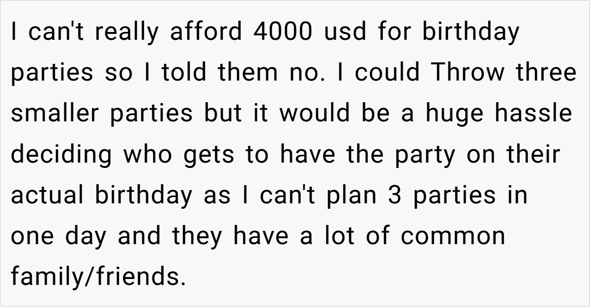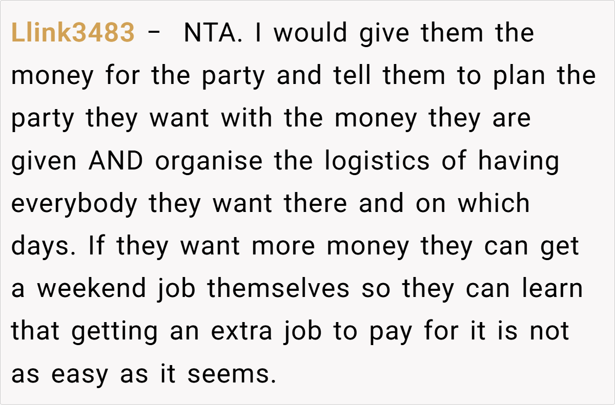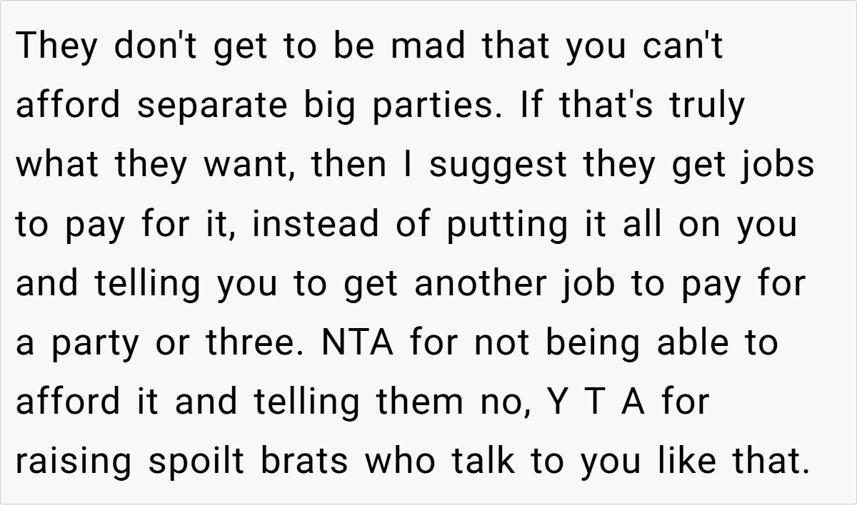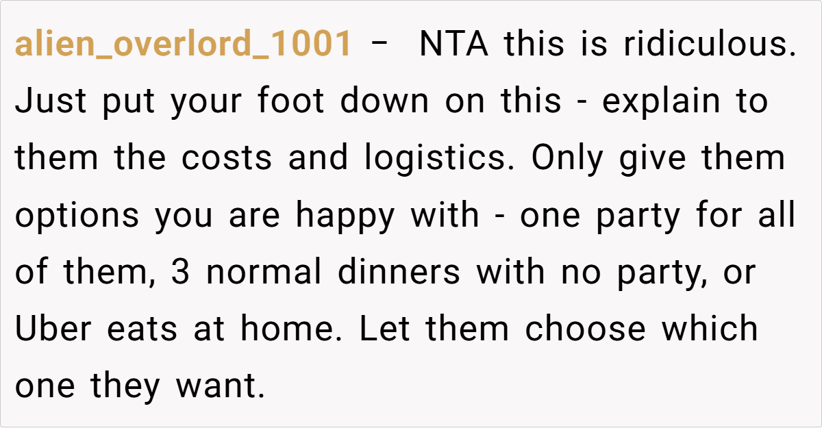 The consensus is that the mom is within her rights to set a budget and impose a single celebration for all three. As one user pointed out, “If they want a bigger party, they need to work for it; you’re already giving them nearly three times their usual budget.” The overall sentiment is clear: responsibility and compromise are key lessons here, and the current demands are a bit too steep.