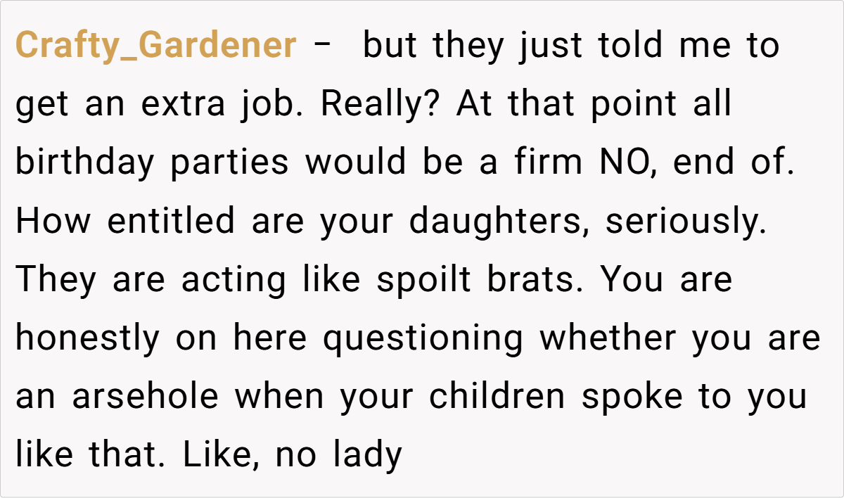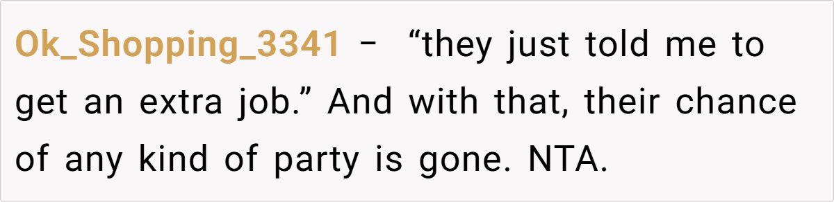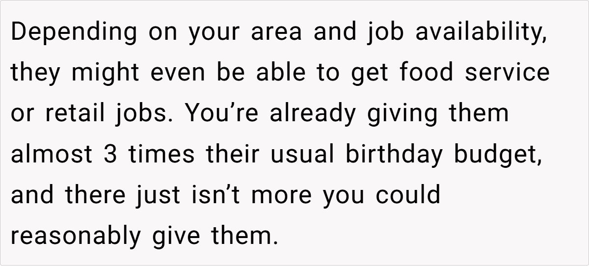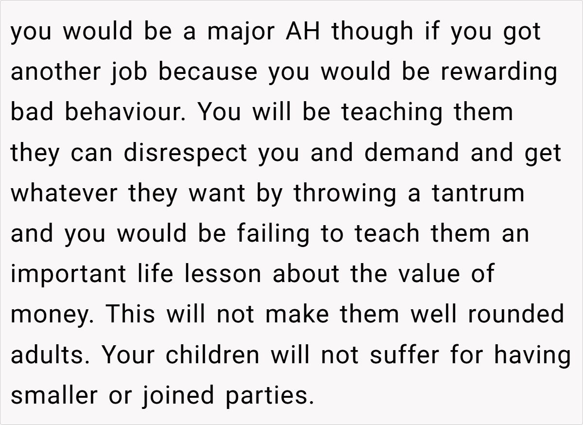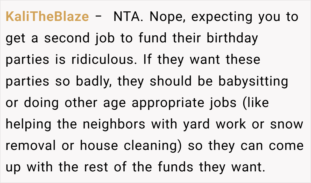 The consensus is that the mom is within her rights to set a budget and impose a single celebration for all three. As one user pointed out, “If they want a bigger party, they need to work for it; you’re already giving them nearly three times their usual budget.” The overall sentiment is clear: responsibility and compromise are key lessons here, and the current demands are a bit too steep.