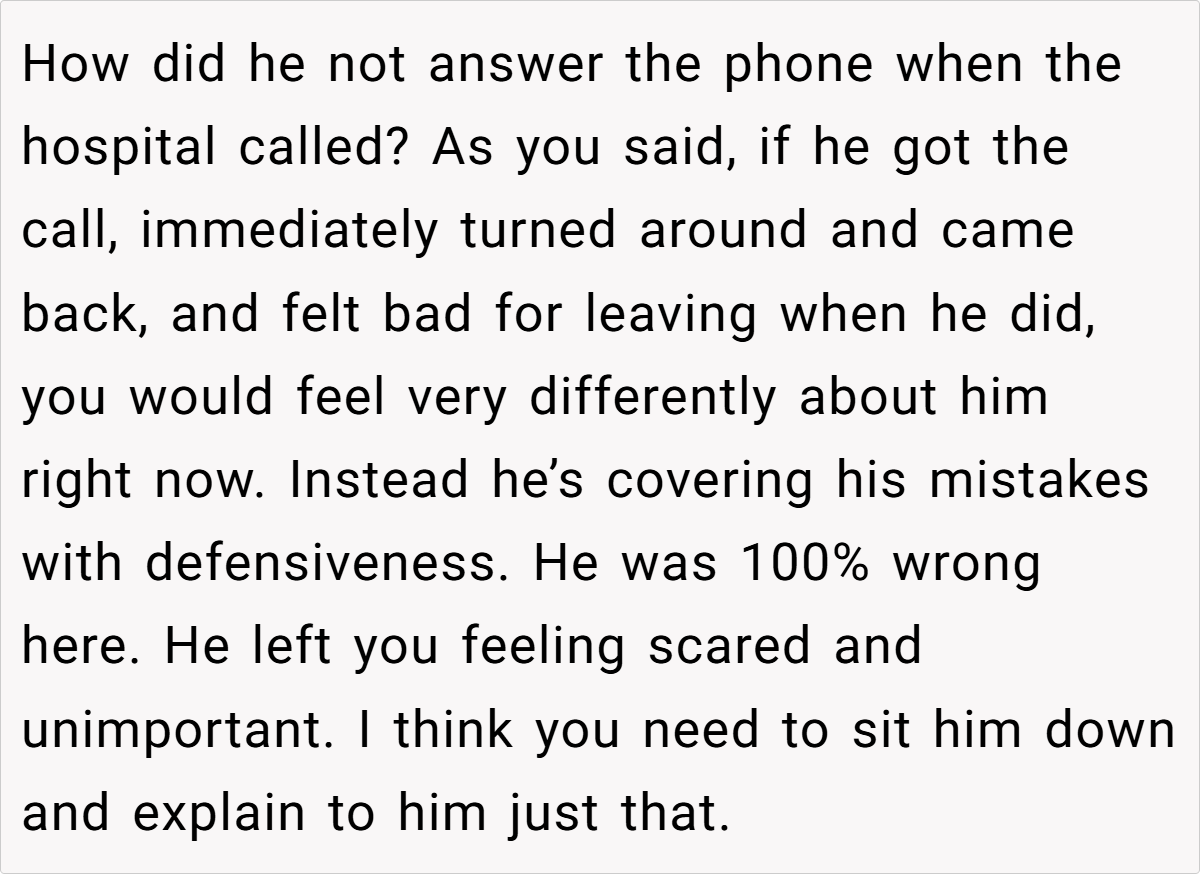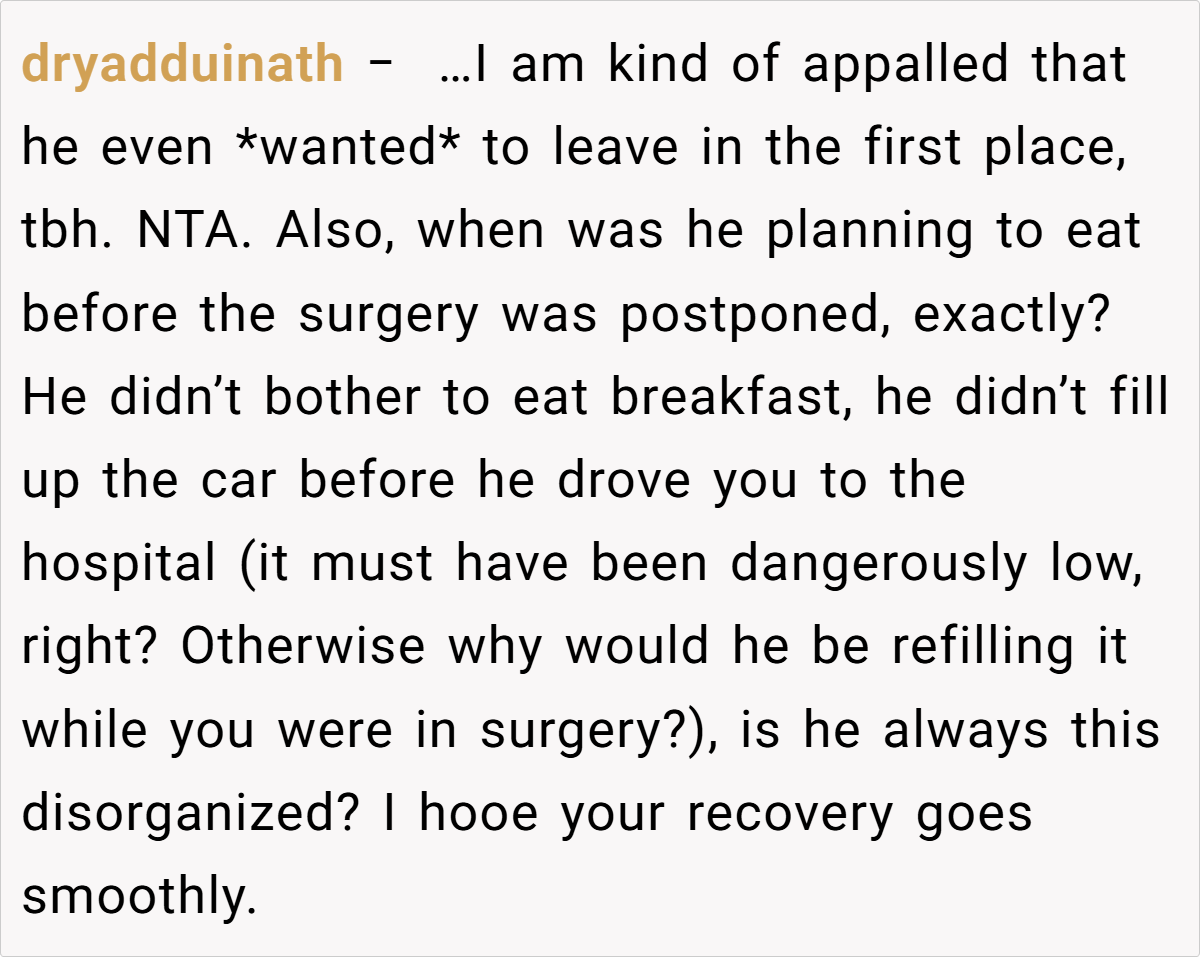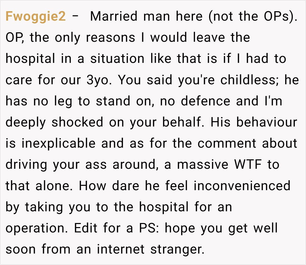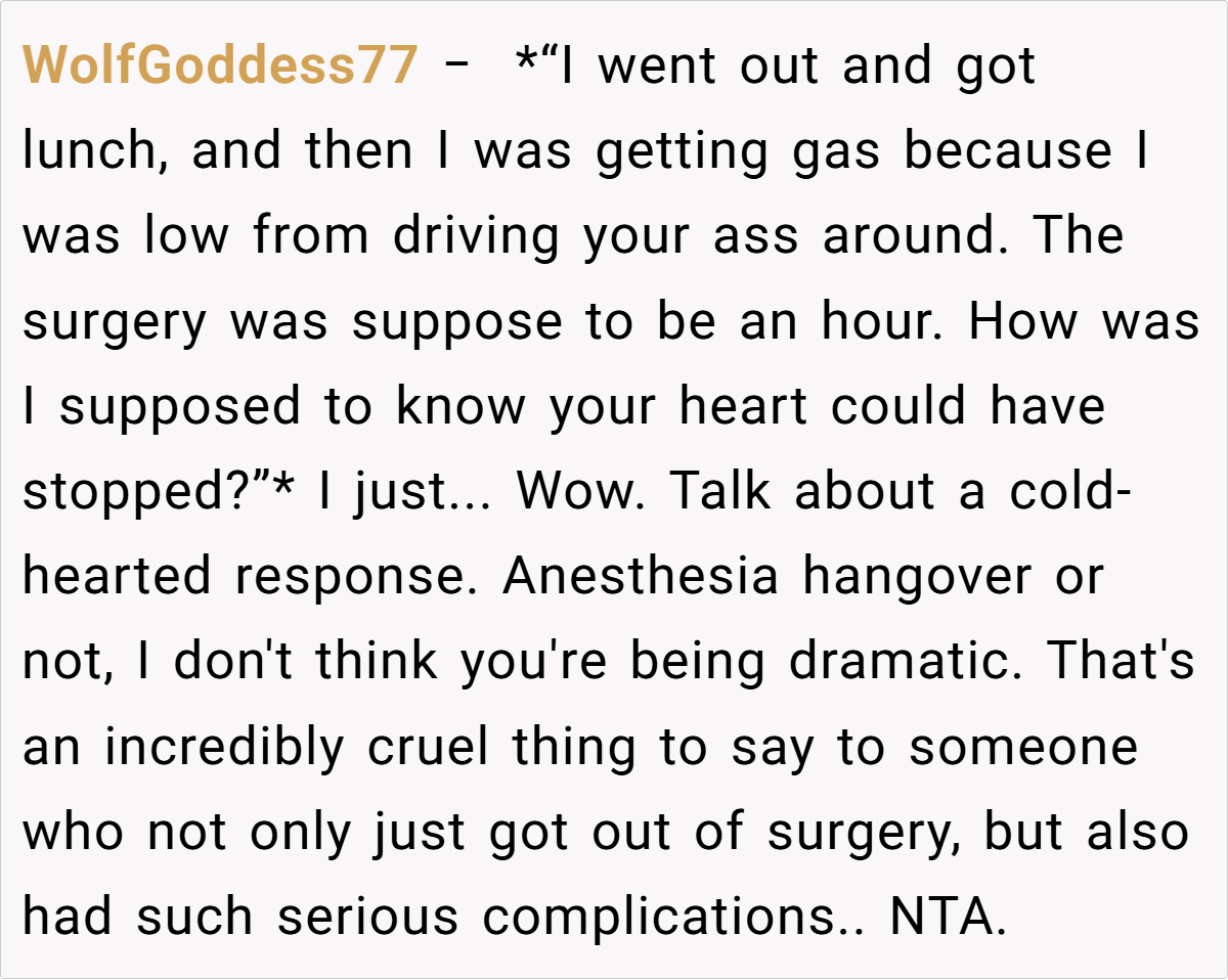 Many community members empathize with the patient’s experience. Some Redditors argue that while practical needs are important, they should never override the need for emotional support during a medical emergency. Others share similar experiences where a partner’s absence during critical moments left them feeling abandoned and unimportant.